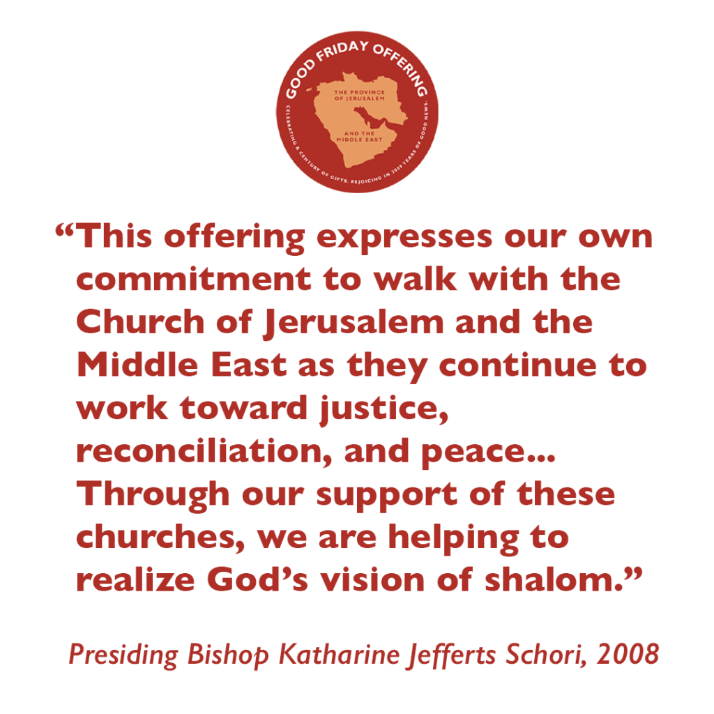 In 2011, the presiding bishop began to anticipate the centennial of the Good Friday Offering, which we celebrate this year, when she wrote, “For almost a century, the Good Friday Offering has been a source of support, love, and hope for our brothers and sisters in The Episcopal Church in Jerusalem and the Middle East.” She notes her own experiences in the region, having been “deeply moved by the stories of pain that conflict and division bring to the lives of every person in that province of the Anglican Communion.”