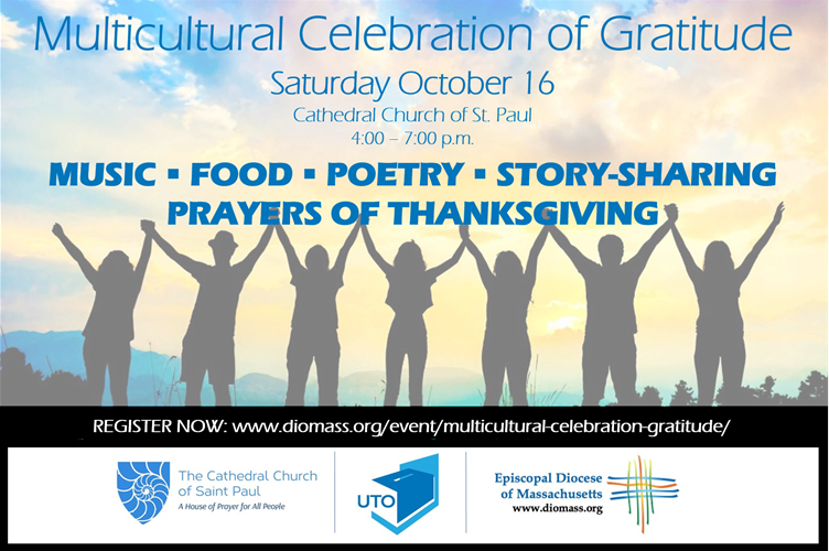 On Oct. 16 from 4:30-6:45 p.m. Eastern, the Cathedral Church of St. Paul in Boston is hosting a Multicultural Celebration of Gratitude. This event will kick off a “Year of Gratitude” in the Episcopal Diocese of Massachusetts, leading up to the 2022 UTO Gratitude Scholars Conference. Join friends from near and far to celebrate God’s gift of gratitude through worship, music, prayers, and sharing stories. All are welcome to join this event, especially if you are interested in hosting a similar event in your community.