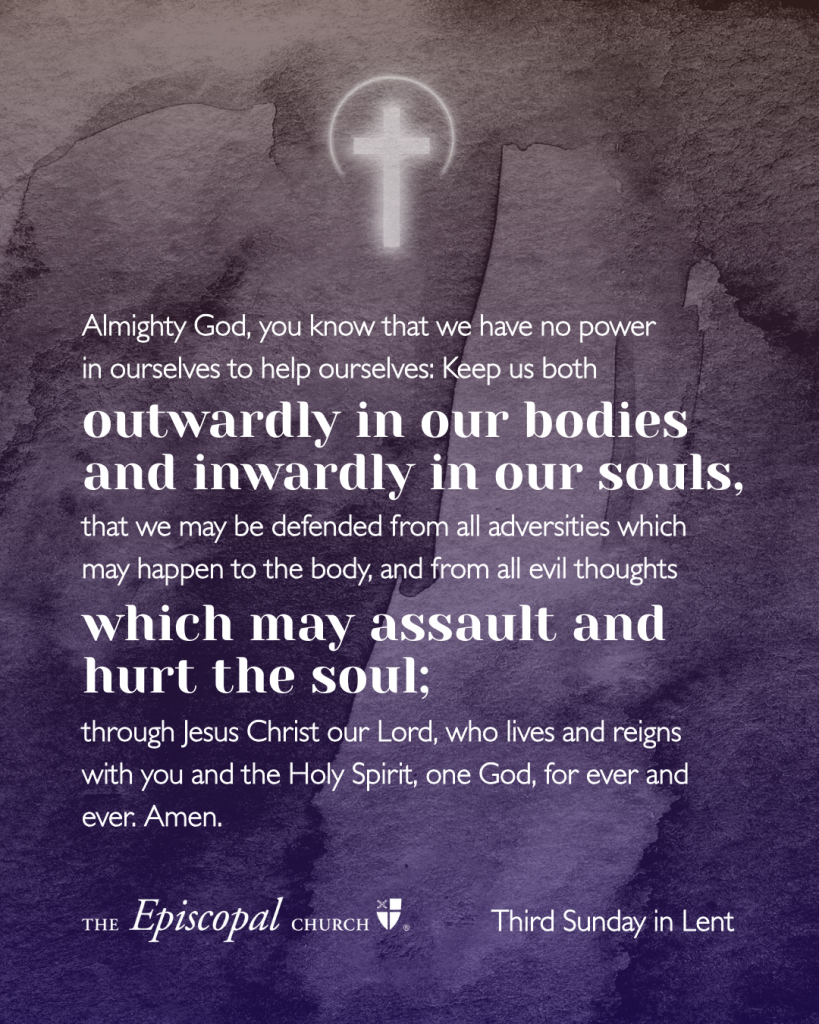 On this Sunday in Lent we turn to the God who knows that we have no power in ourselves to help ourselves. Thirsty in body and soul, we are met by Christ, who offers living water that quenches our deepest need and restores our hope. Defended by God’s grace and love, we learn to trust the Savior of the world who sustains us, heals us, and draws us into true life.