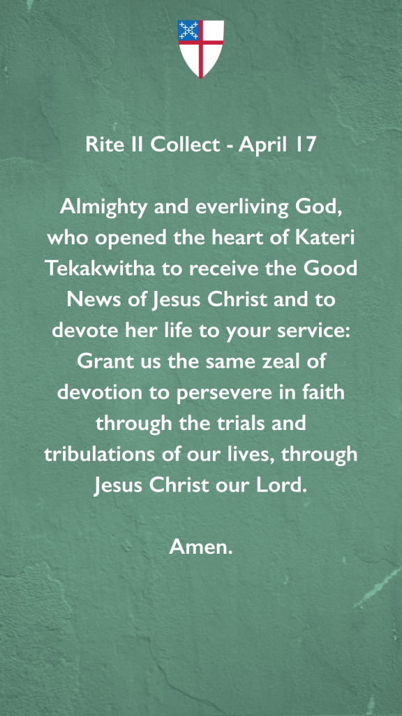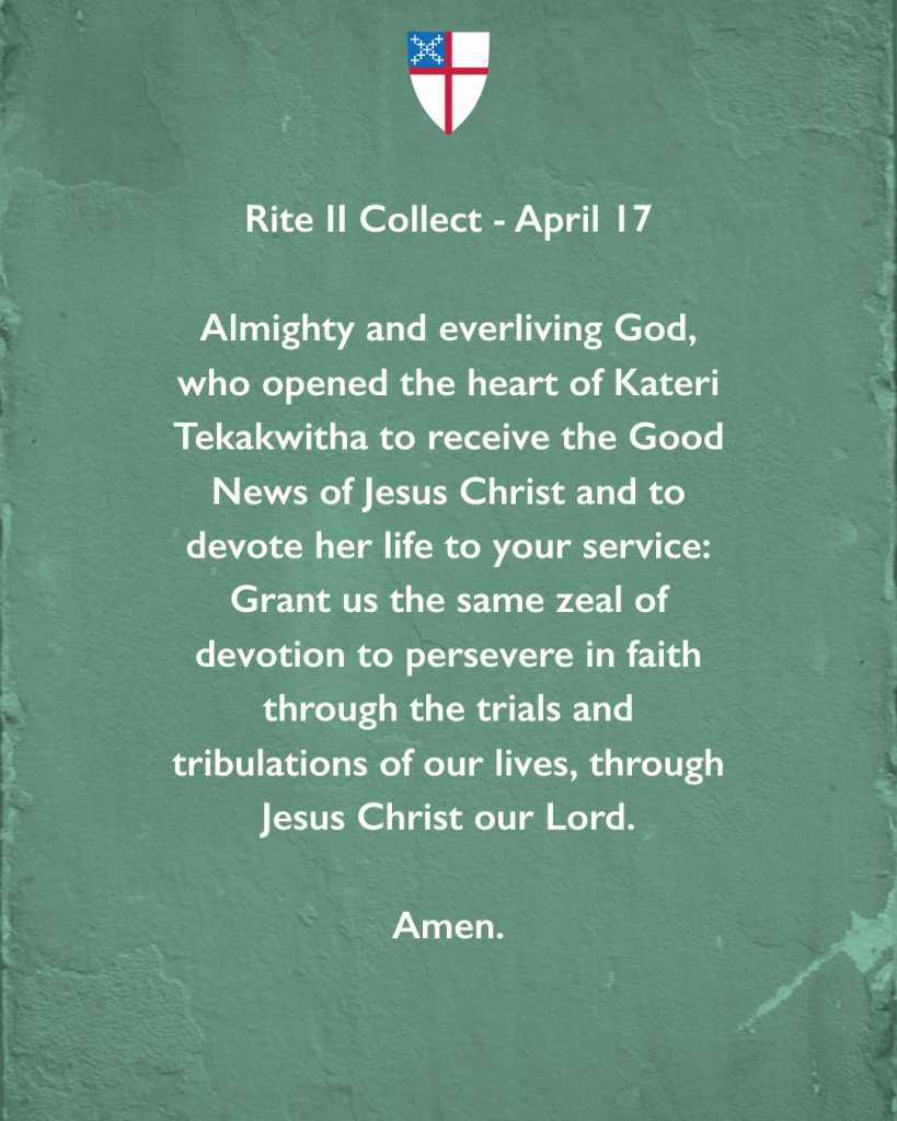 Almighty and everliving God, who didst open the heart of Kateri Tekakwitha to receive the Good News of Jesus Christ and to devote her life to thy service: Grant us the same zeal of devotion to persevere in faith through the trials and tribulations of our lives, through Jesus Christ our Lord. Amen.