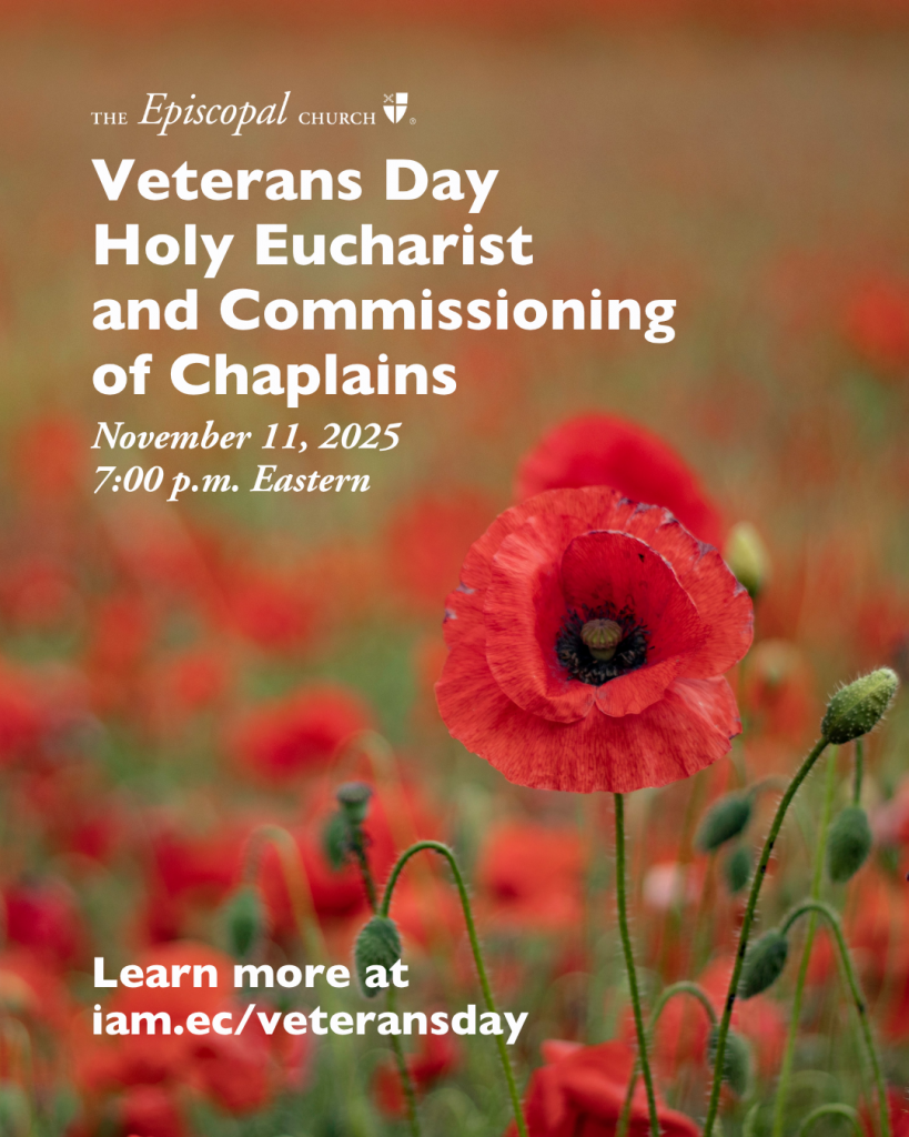 - Episcopalians invited to first Veterans Day Holy Eucharist and Commissioning of ChaplainsEpiscopalians are invited to join a first-time churchwide Veterans Day Holy Eucharist service at 7 p.m. ET Nov. 11—via livestream or in person at the Church Center chapel in New York City—to honor those who have served in the military and specially recognize the Episcopal chaplains who support them.