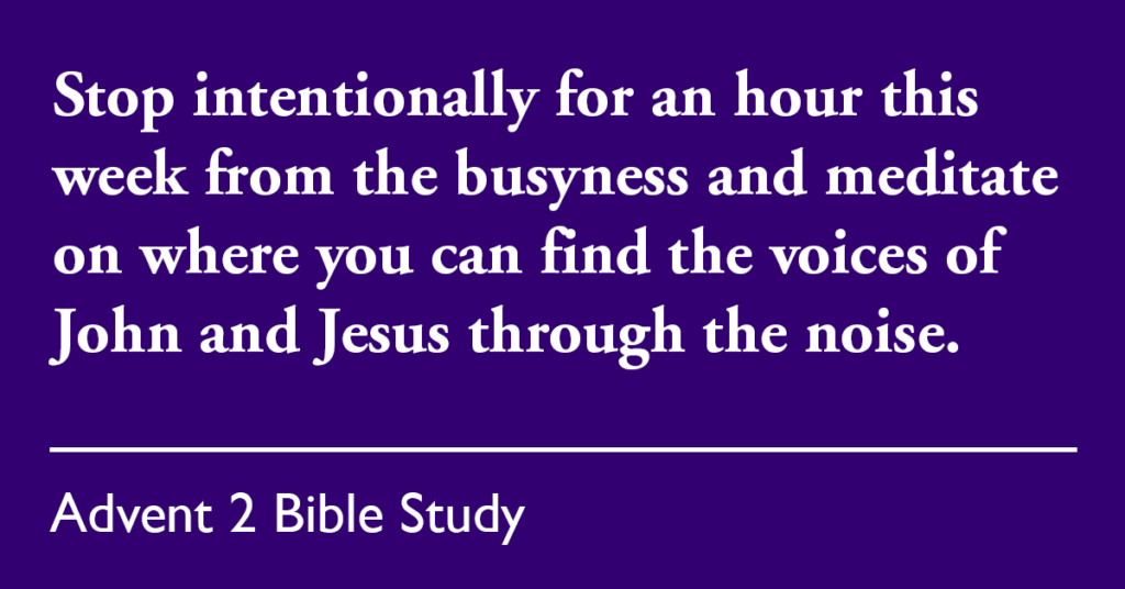 1. It can be easy, especially now that December has begun, to fall into busyness, filling our hours with all the things that must be done. Stop intentionally for an hour this week from the busyness and meditate on where you can find the voices of John and Jesus through the noise. How did it feel? Could you try it again this week?