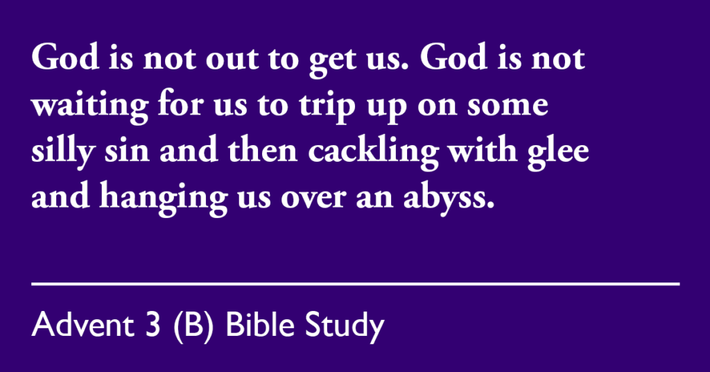 But we’ve already learned that justice and joy are partners in God’s kingdom. God is not out to get us. God is not waiting for us to trip up on some silly sin and then cackling with glee and hanging us over an abyss. God’s will is our growing up into the full stature of Christ, becoming capable of partnering with God in bringing God’s justice to fruition on the earth. So how does God do that?