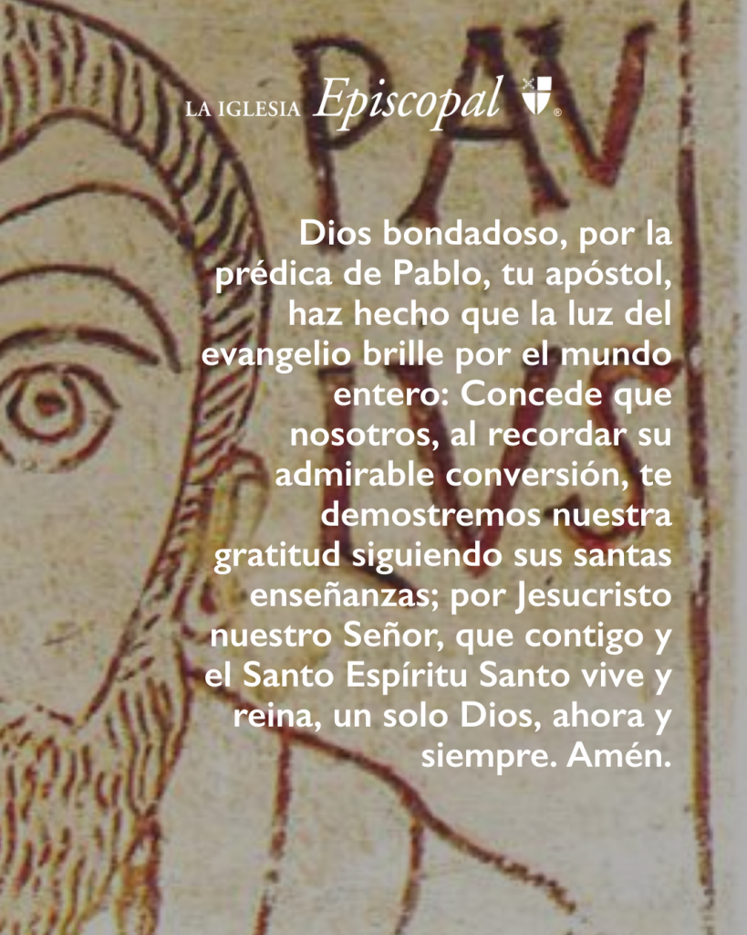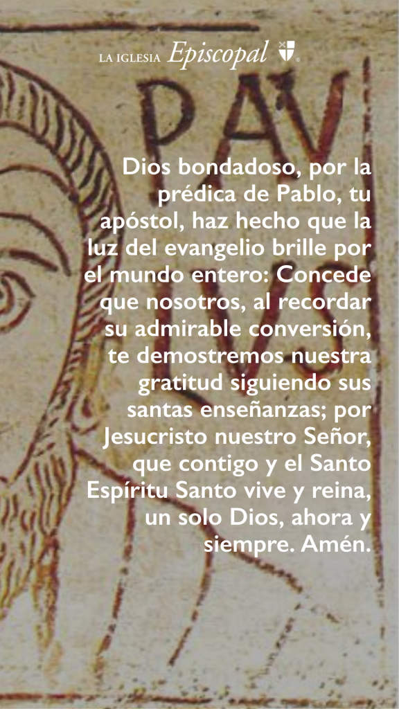 Dios bondadoso, por la prédica de Pablo, tu apóstol, haz hecho que la luz del evangelio brille por el mundo entero: Concede que nosotros, al recordar su admirable conversión, te demostremos nuestra gratitud siguiendo sus santas enseñanzas; por Jesucristo nuestro Señor, que contigo y el Santo Espíritu Santo vive y reina, un solo Dios, ahora y siempre. Amén.
