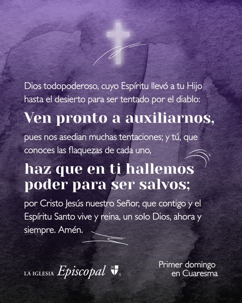 Dios todopoderoso, cuyo Espíritu llevó a tu Hijo hasta el Desierto para ser tentado por el diablo: Ven pronto a auxiliarnos, pues nos asedian muchas tentaciones; y tú, que conoces las flaquezas de cada uno, haz que en ti hallemos poder para ser salvos; por Cristo Jesús nuestro Señor, que contigo y el Espíritu Santo vive y reina, un solo Dios, ahora y siempre. Amén.