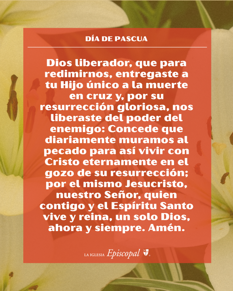 Dios de todo poder, que mediante tu Hijo único, Jesucristo, venciste la muerte y abriste las puertas de la vida eterna: Concede que tu Espíritu, dador de vida, nos levante, de la muerte del pecado, a quienes hoy celebramos su resurrección; por Jesucristo nuestro Señor, quien contigo y el Espíritu Santo vive y reina, un solo Dios, ahora y siempre. Amén.