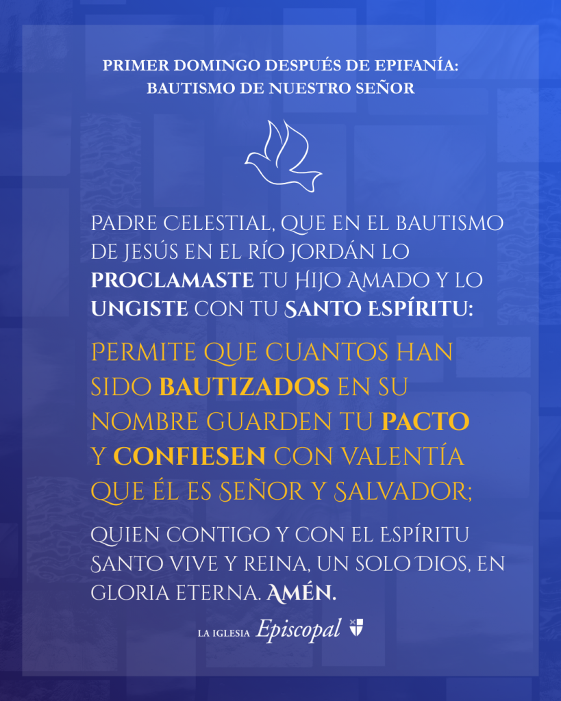 En esta fiesta del Bautismo de nuestro Señor, recordamos la voz del cielo que proclama a Jesús como el Hijo amado y el Espíritu que desciende sobre él con poder. Oramos para que todos los que son bautizados en su nombre puedan mantener el pacto que han hecho y confesar con valentía a Cristo como Señor y Salvador. Fortalecidos por el Espíritu que nos unge y nos guía, caminamos por el camino de Aquel que trae justicia, paz y nueva vida al mundo. #Episcopal
