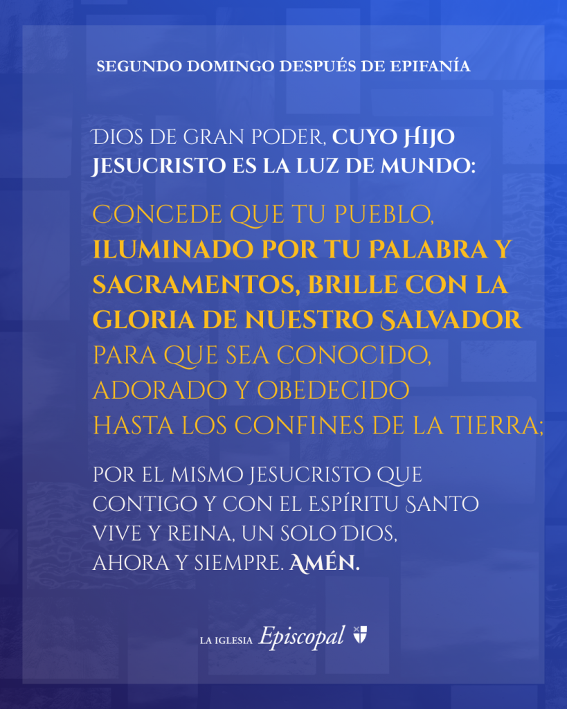 Dios de gran poder, cuyo Hijo Jesucristo es la luz de mundo: Concede que tu pueblo, iluminado por tu Palabra y sacramentos, brille con la gloria de nuestro Salvador para que sea conocido, adorado y obedecido hasta los confines de la tierra; por el mismo Jesucristo que contigo y con el Espíritu Santo vive y reina, un solo Dios, ahora y siempre. Amén.
