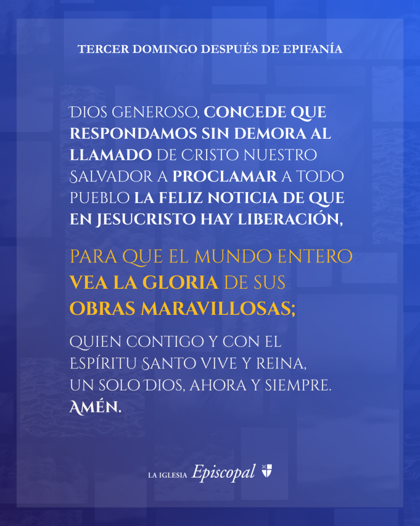 Pedimos a Dios la gracia para responder con prontitud al llamado de nuestro Salvador Jesucristo y proclamar la Buena Nueva de su salvación. La gran luz que brilló sobre aquellos que estaban sentados en tinieblas sigue resplandeciendo, atrayéndonos a la obra del reino de Cristo. Siguiendo a Aquel que nos llama, nos unimos para dar a conocer sus maravillosas obras al mundo entero. #Episcopal
