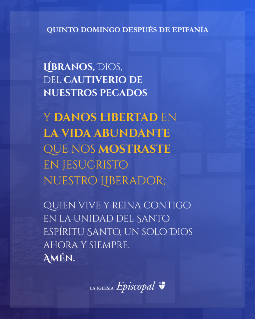 Líbranos, Dios, del cautiverio de nuestros pecados y danos libertad en la vida abundante que nos mostraste en Jesucristo nuestro Liberador; Quien vive y reina contigo en la unidad del Santo Espíritu Santo, un solo Dios ahora y siempre. Amén.