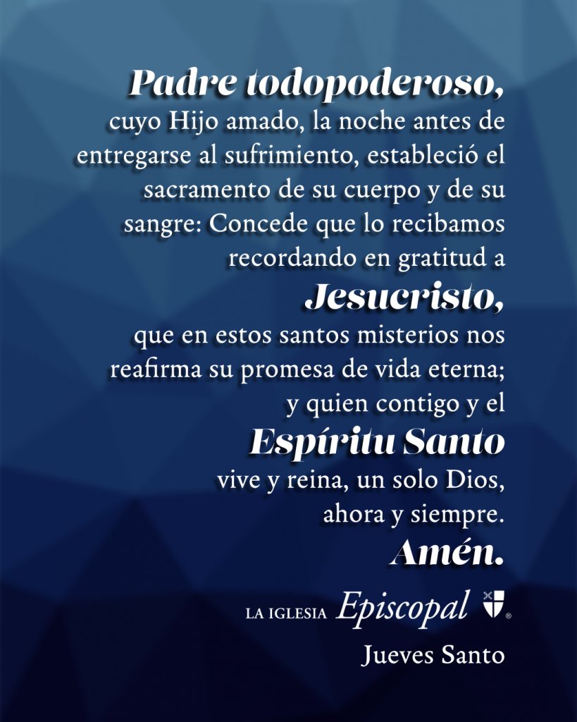 Padre todopoderoso, cuyo Hijo amado, la noche antes de entregarse al sufrimiento, estableció el sacramento de su cuerpo y de su sangre: Concede que lo recibamos recordando en gratitud a Jesucristo, que en estos santos misterioso nos reafirma su promesa de vida eterna; y quien contigo y el Espíritu Santo vive y reina, un solo Dios, ahora y siempre. Amén.