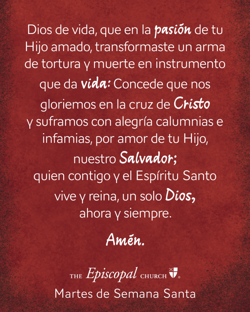 Dios de vida, que en la pasión de tu Hijo amado, transformaste un arma de tortura y muerte en instrumento que da vida: Concede que nos gloriemos en la cruz de Cristo y suframos con alegría calumnias e infamias, por amor de tu Hijo, nuestro Salvador; quien contigo y el Espíritu Santo vive y reina, un solo Dios, ahora y siempre. Amén.