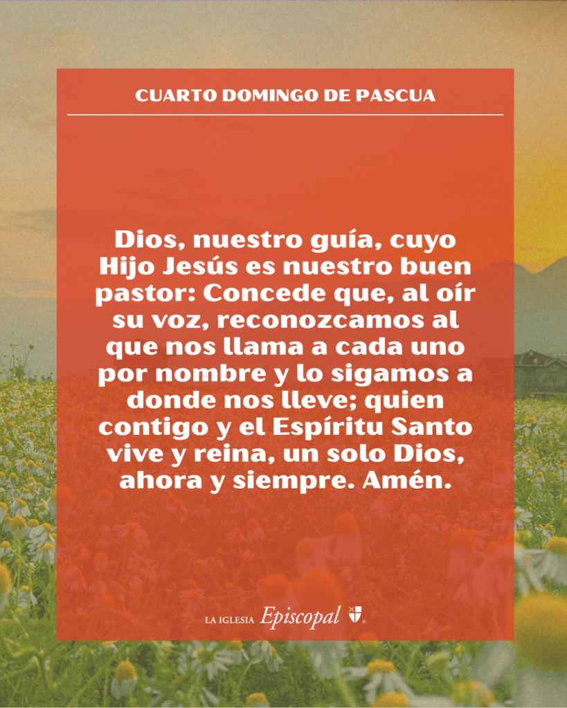 Dios, nuestro guía, cuyo Hijo Jesús es nuestro buen pastor: Concede que, al oír su voz, reconozcamos al que nos llama a cada uno por nombre y lo sigamos a donde nos lleve; quien contigo y el Espíritu Santo vive y reina, un solo Dios, ahora y siempre. Amén.