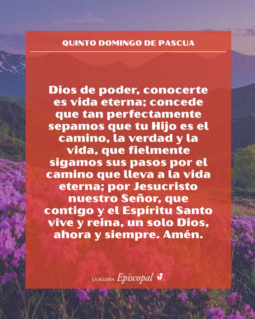 Dios de poder, conocerte es vida eterna; concede que tan perfectamente sepamos que tu Hijo es el camino, la verdad y la vida, que fielmente sigamos sus pasos por el camino que lleva a la vida eterna; por Jesucristo nuestro Señor, que contigo y el Espíritu Santo vive y reina, un solo Dios, ahora y siempre. Amén.