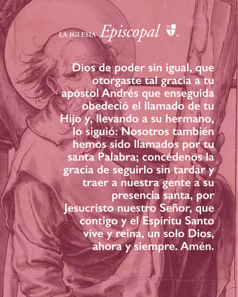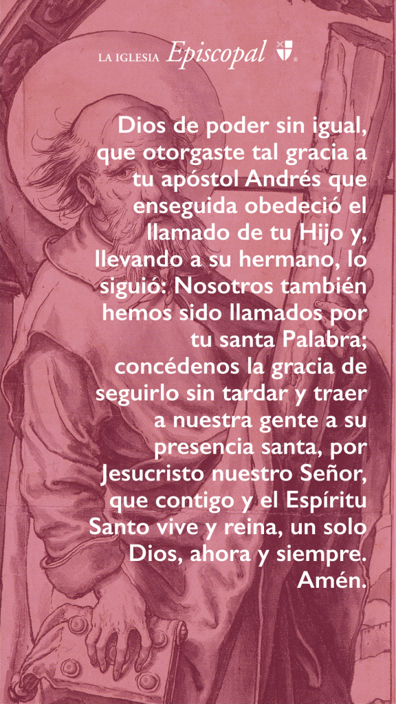 Dios todopoderoso, que diste a tu apóstol Andrés una gracia tal que prestamente obedeció el llamado de tu Hijo Jesucristo y trajo a su hermano con él: Concédenos, a los llamados por tu Santo Verbo, la gracia para seguirle sin demora y traer a su bondadosa presencia a los que amamos; por aquél que vive y reina contigo y el Espíritu Santo, un solo Dios, ahora y por siempre. Amén.