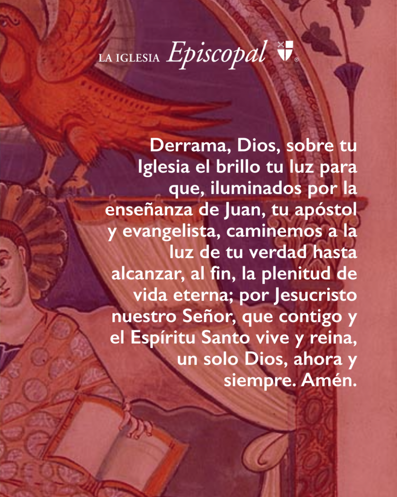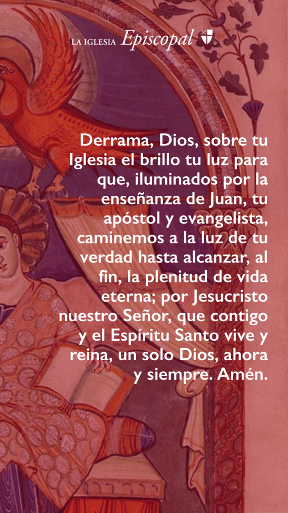 Derrama, oh Señor, sobre tu Iglesia el resplandor de tu luz, para que, iluminados por la enseñanza de tu apóstol y evangelista Juan, andemos en la luz de tu verdad de tal manera que al fin alcancemos la plenitud de la vida eterna; por Jesucristo nuestro Señor, que vive y reina contigo y el Espíritu Santo, un solo Dios, por los siglos de los siglos. Amén.