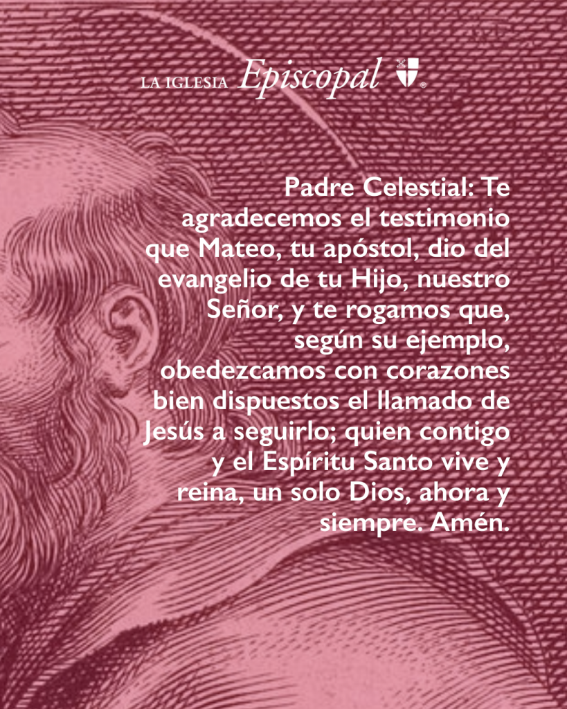 Te damos gracias, Padre celestial, por el testimonio que tu apóstol y evangelista Mateo dio a las Buenas Nuevas de tu Hijo nuestro Salvador; y rogamos que, siguiendo su ejemplo, obedezcamos con voluntades y corazones dispuestos el llamado de nuestro Señor a seguirle; por Jesucristo nuestro Señor, que vive y reina contigo y el Espíritu Santo, un solo Dios, ahora y por siempre. Amén.