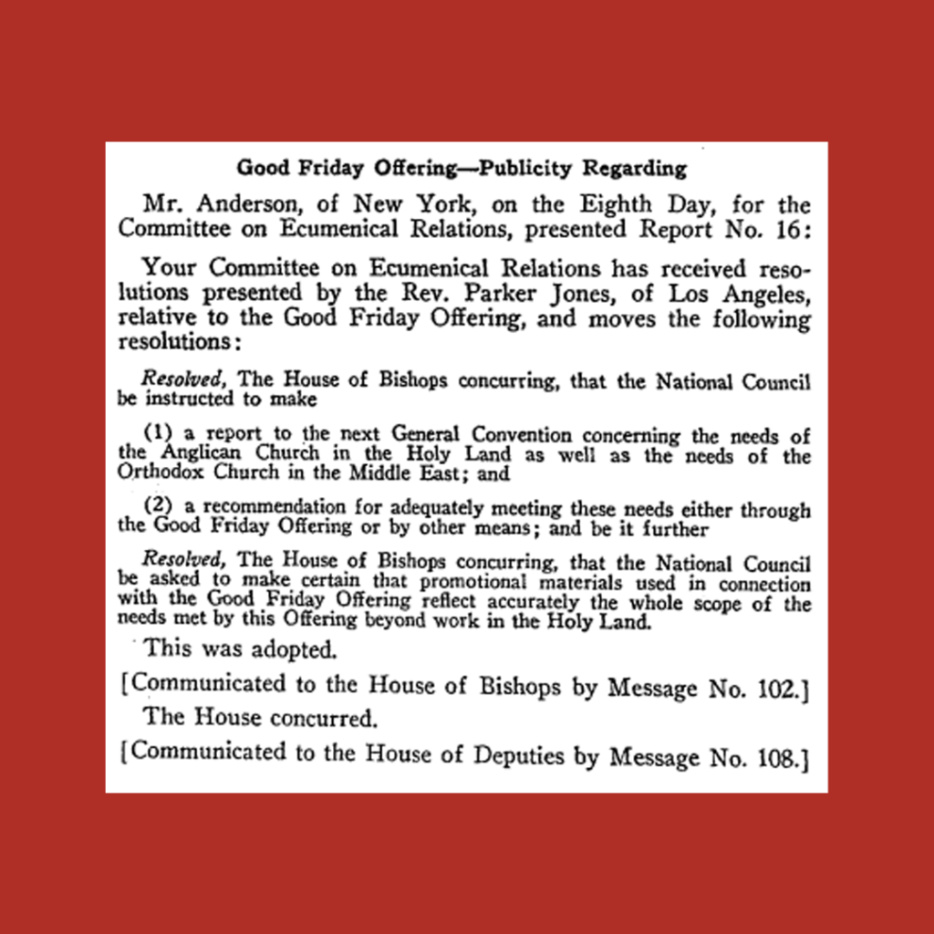 The Good Friday Offering continued to benefit from generous Episcopalians. Beginning in 1955, a base offering of $15,000 was appropriated to the mission in Jerusalem and the Near East, and the National Council was directed to distribute the balance of funds to promote mission work in the region and to support Eastern Orthodox churches.