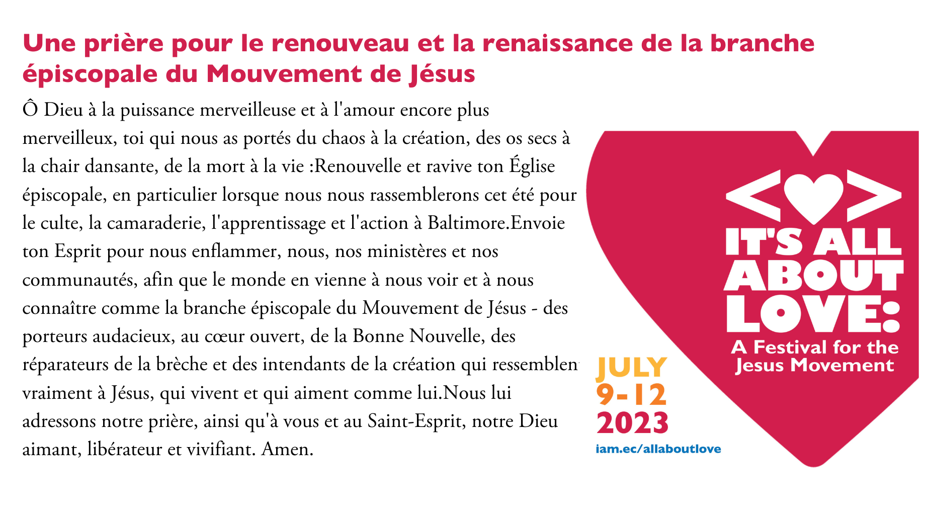 Dans toute l’église et dans le monde entier, nous avons faim de réveil et de renouveau. Rejoignez-nous pour « It’s All About Love », un festival de culte, d’apprentissage, de communauté et d’action pour la branche épiscopale du Mouvement Jésus, qui se tiendra du dimanche 9 au mercredi 12 juillet au Baltimore Convention Center.