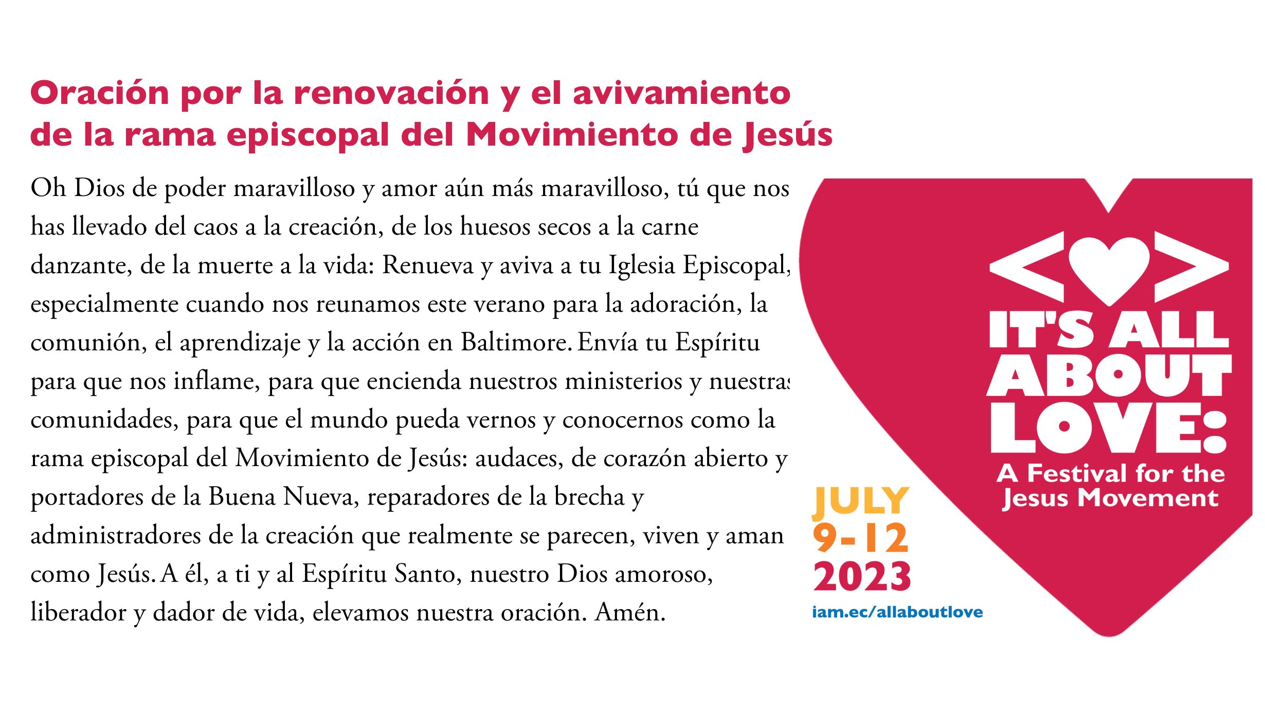 En toda la Iglesia y alrededor del mundo, tenemos hambre de avivamiento y renovación. Acompáñenos en “Todo gira en torno al amor”, un festival de adoración, aprendizaje, comunidad y acción en toda la iglesia para la rama episcopal del Movimiento de Jesús, que se llevará a cabo del domingo 9 al miércoles 12 de julio en el Centro de Convenciones de Baltimore.