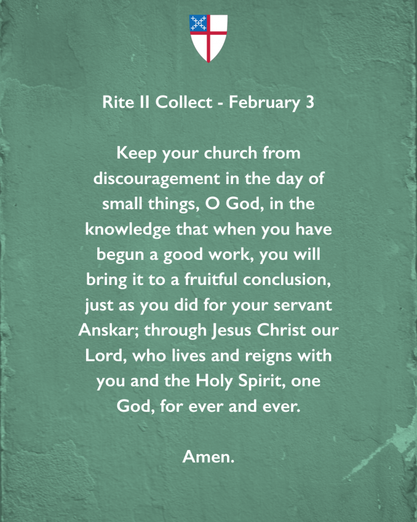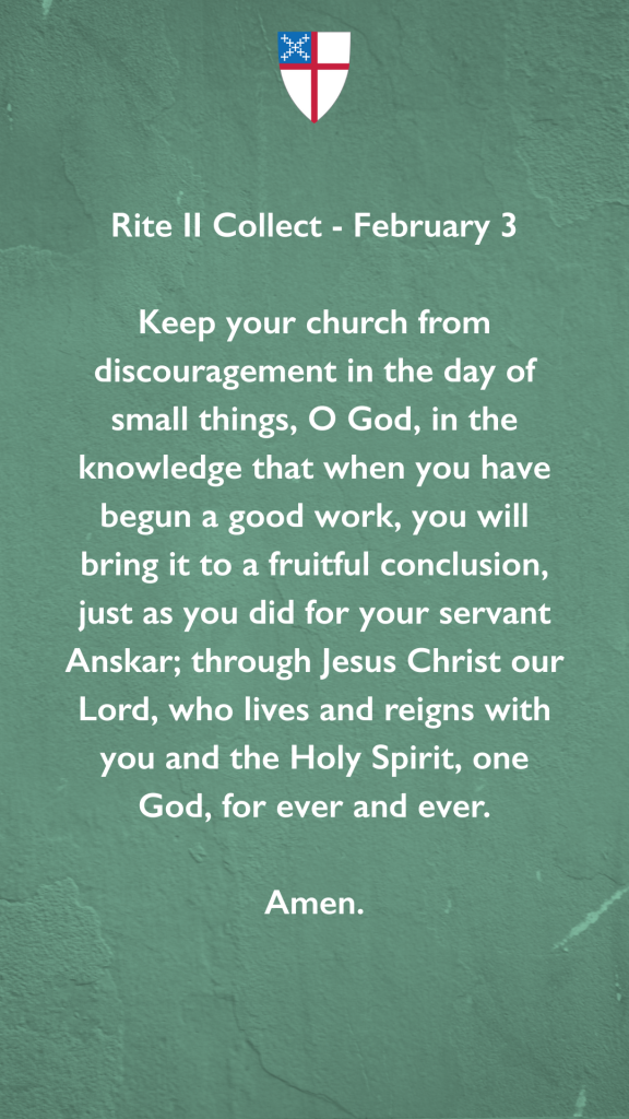 Keep your church from discouragement in the day of small things, O God, in the knowledge that when you have begun a good work, you will bring it to a fruitful conclusion, just as you did for your servant Anskar; through Jesus Christ our Lord, who lives and reigns with you and the Holy Spirit, one God, for ever and ever. Amen.
