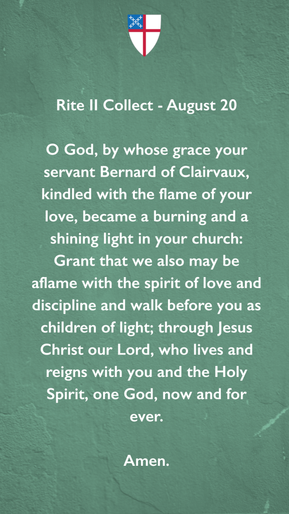 O God, by whose grace your servant Bernard of Clairvaux, kindled with the flame of your love, became a burning and a shining light in your Church: Grant that we also may be aflame with the spirit of love and discipline and walk before you as children of light; through Jesus Christ our Lord, who lives and reigns with you and the Holy Spirit, one God, now and for ever. Amen.