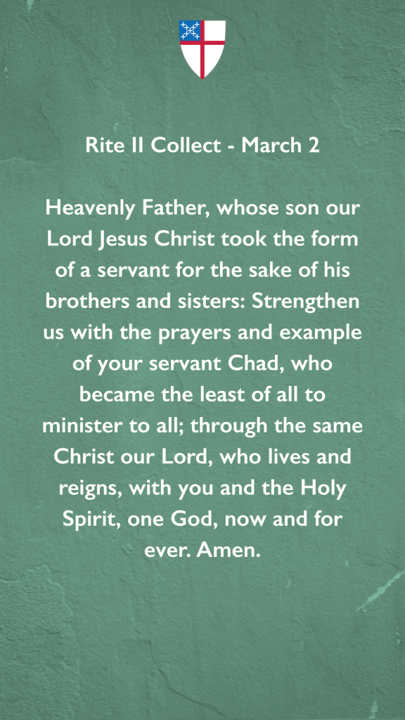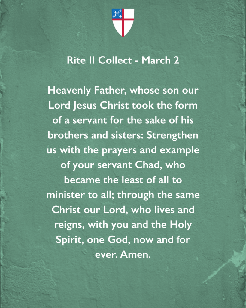 Heavenly Father, whose son our Lord Jesus Christ took the form of a servant for the sake of his brothers and sisters: Strengthen us with the prayers and example of your servant Chad, who became the least of all to minister to all; through the same Christ our Lord, who lives and reigns, with you and the Holy Spirit, one God, now and for ever. Amen.