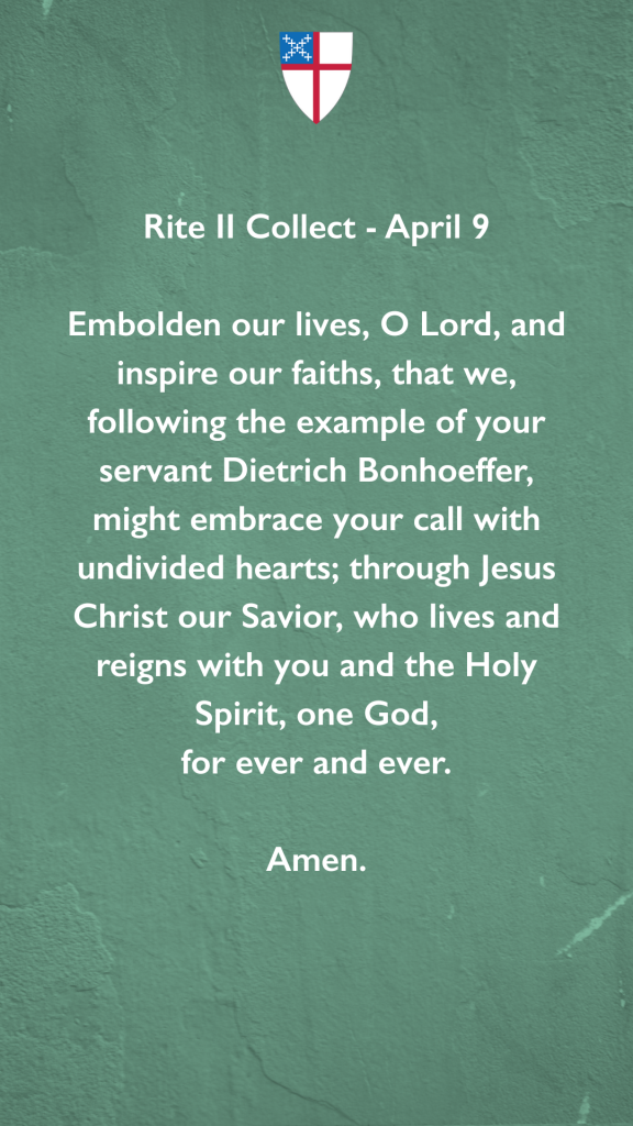 Embolden our lives, O Lord, and inspire our faiths, that we, following the example of thy servant Dietrich Bonhoeffer, might embrace thy call with undivided hearts; through Jesus Christ our Savior, with liveth and reigneth with thee and the Holy Ghost, one God, for ever and ever. Amen.