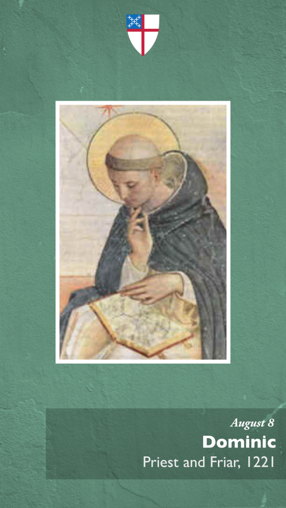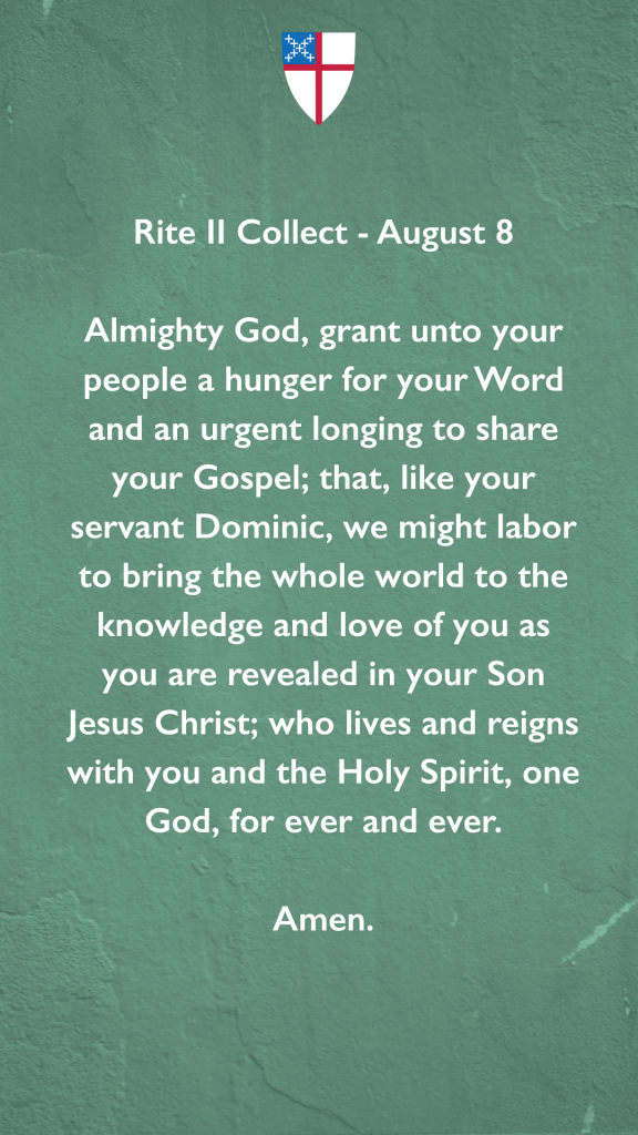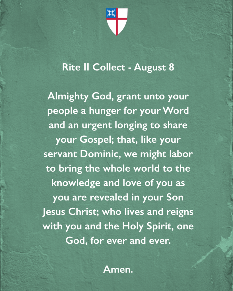 Almighty God, grant unto thy people a hunger for thy Word and an urgent longing to share thy Gospel; that, like thy servant Dominic, we might labor to bring the whole world to the knowledge and love of thee as thou art revealed in thy Son Jesus Christ; who liveth and reigneth with thee and the Holy Ghost, one God, for ever and ever. Amen.