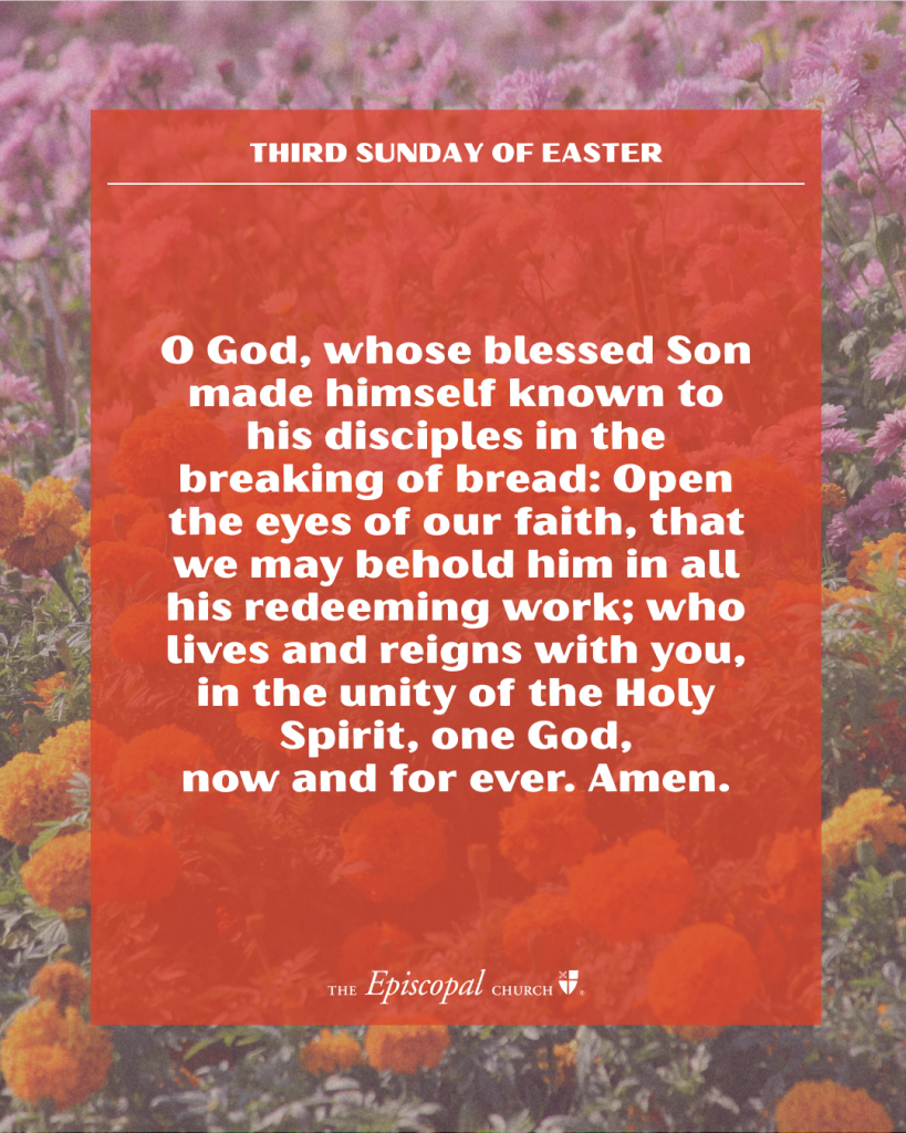 O God, whose blessed Son made himself known to his disciples in the breaking of bread: Open the eyes of our faith, that we may behold him in all his redeeming work; who lives and reigns with you, in the unity of the Holy Spirit, one God, now and for ever. Amen.