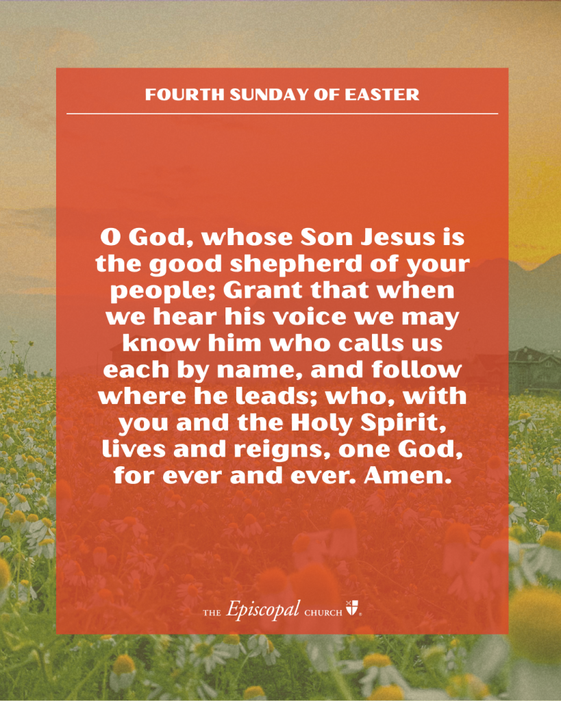O God, whose Son Jesus is the good shepherd of your people: Grant that when we hear his voice we may know him who calls us each by name, and follow where he leads; who, with you and the Holy Spirit, lives and reigns, one God, for ever and ever. Amen.