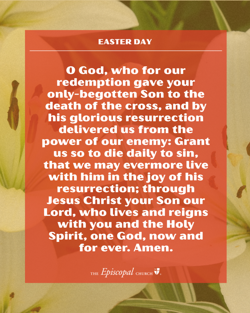 O God, who for our redemption gave your only-begotten Son to the death of the cross, and by his glorious resurrection delivered us from the power of our enemy: Grant us so to die daily to sin, that we may evermore live with him in the joy of his resurrection; through Jesus Christ your Son our Lord, who lives and reigns with you and the Holy Spirit, one God, now and for ever. Amen.