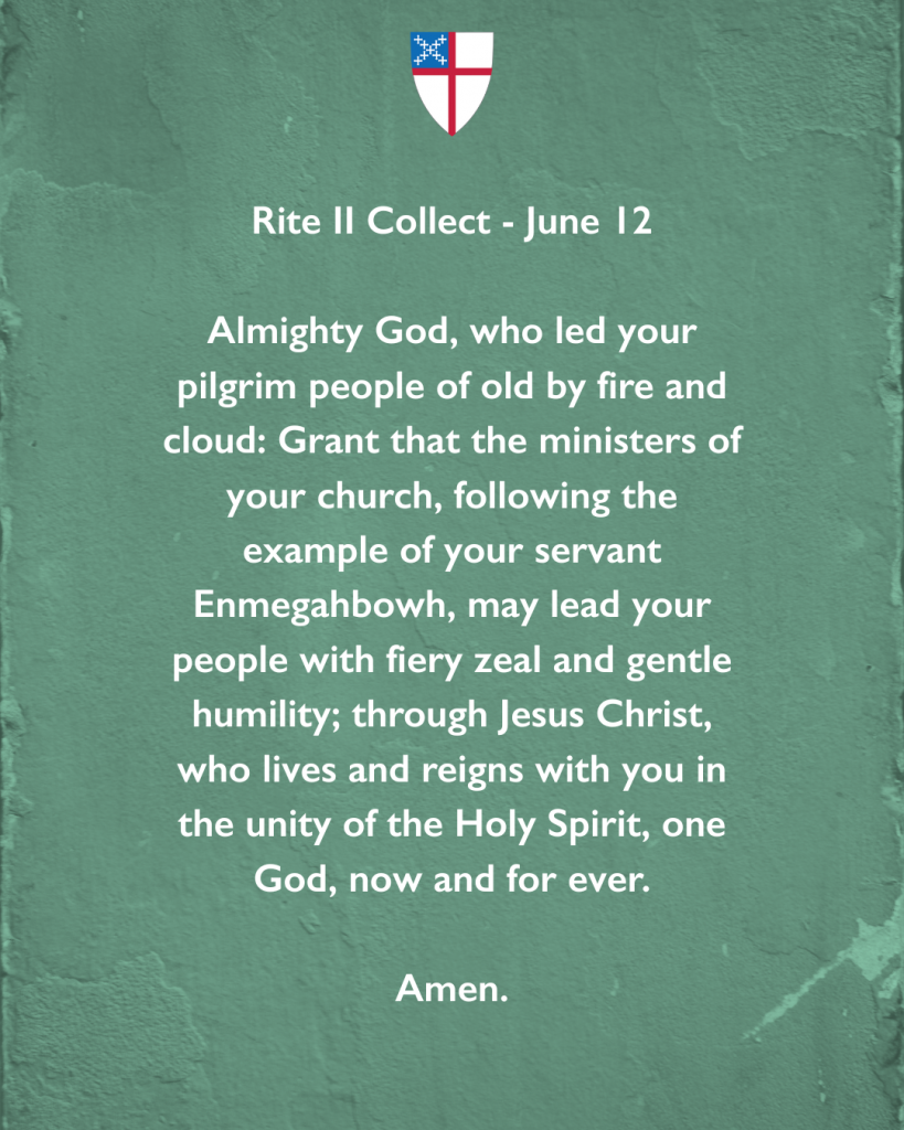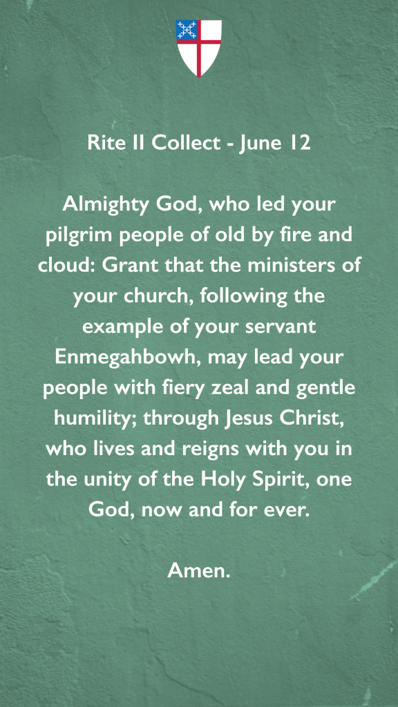 Almighty God, who led your pilgrim people of old by fire and cloud: Grant that the ministers of your church, following the example of your servant Enmegahbowh, may lead your people with fiery zeal and gentle humility; through Jesus Christ, who lives and reigns with you in the unity of the Holy Spirit, one God, now and for ever. Amen.