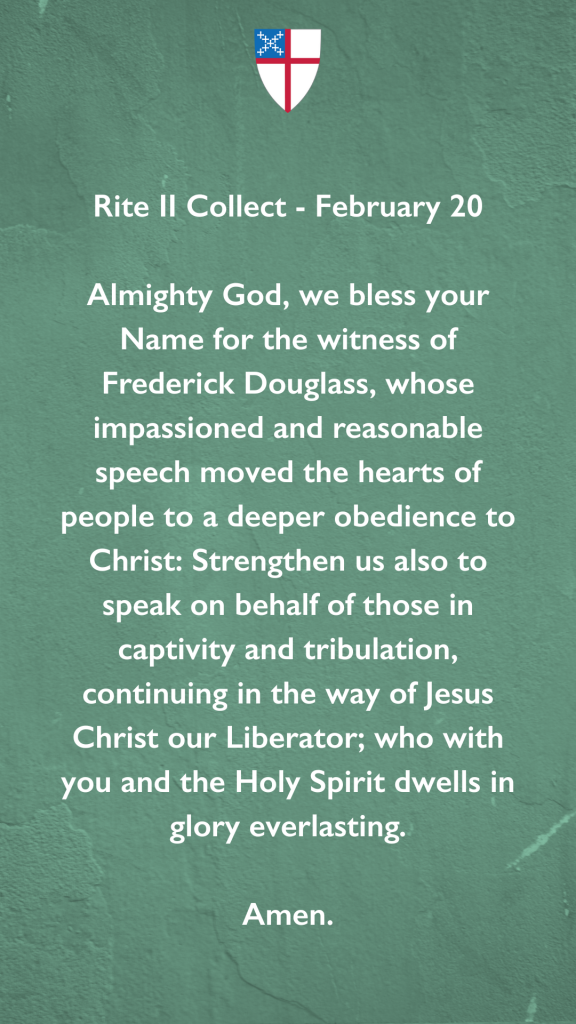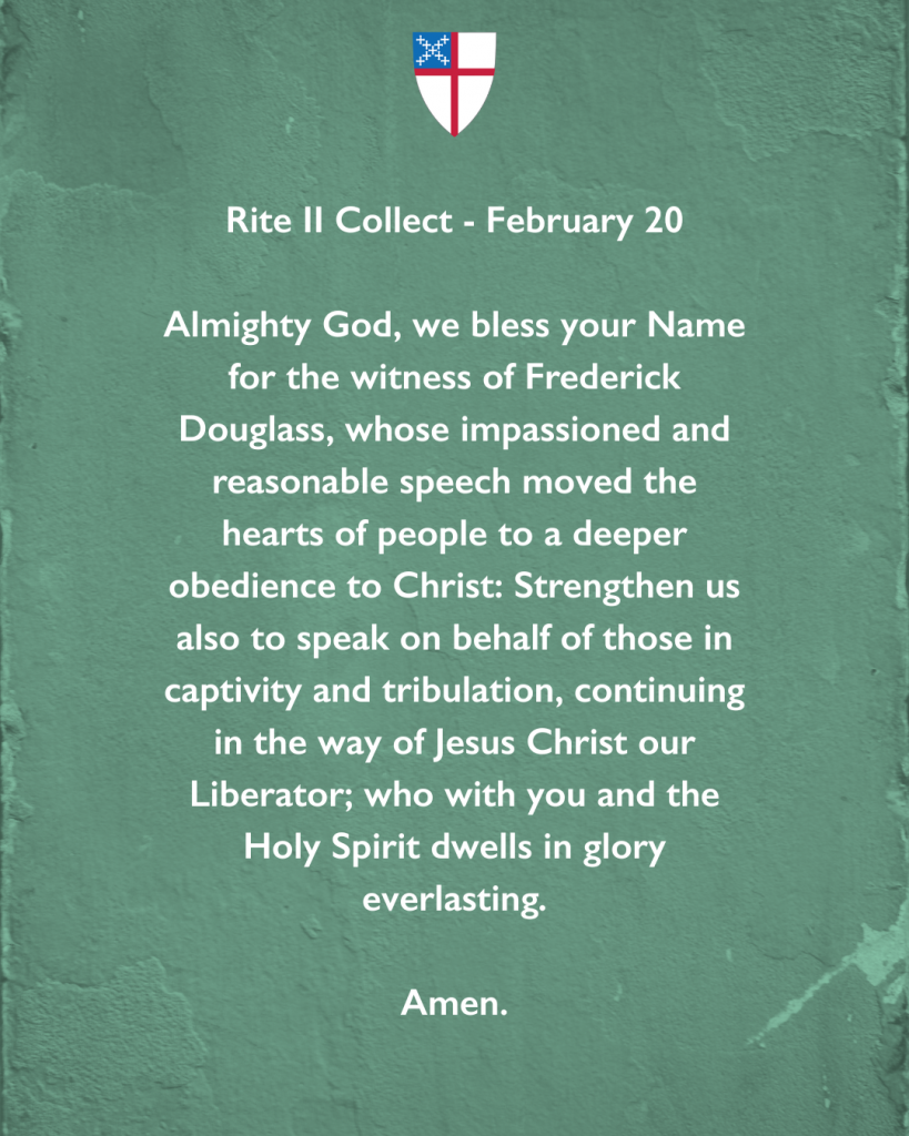 Almighty God, we bless your Name for the witness of Frederick Douglass, whose impassioned and reasonable speech moved the hearts of people to a deeper obedience to Christ: Strengthen us also to speak on behalf of those in captivity and tribulation, continuing in the way of Jesus Christ our Liberator; who with you and the Holy Spirit dwells in glory everlasting. Amen.