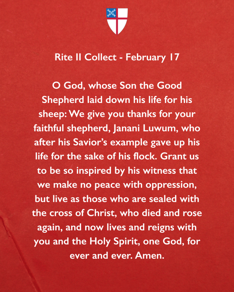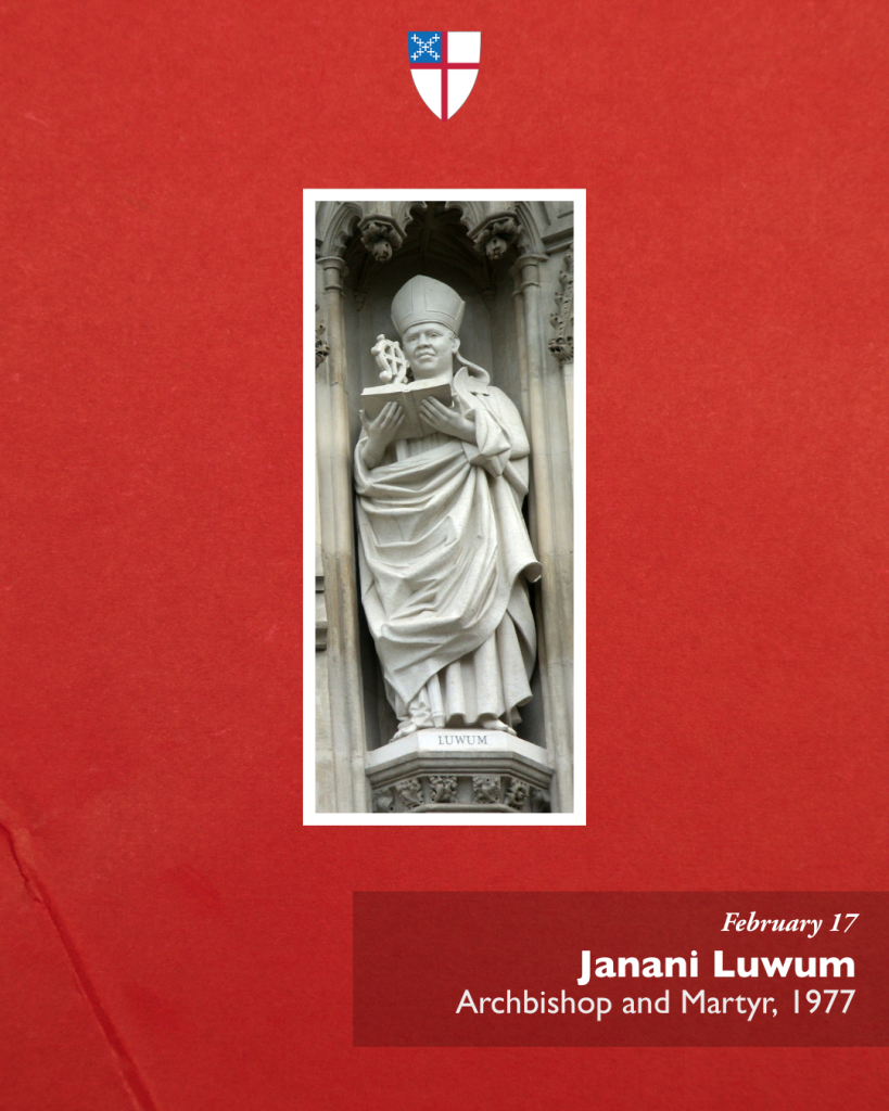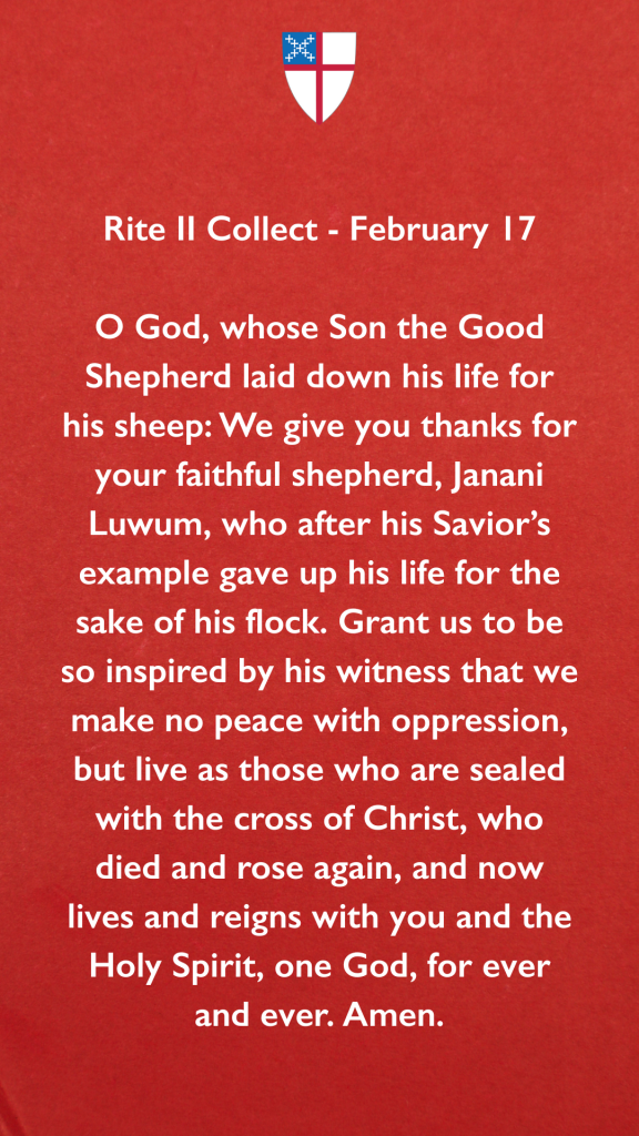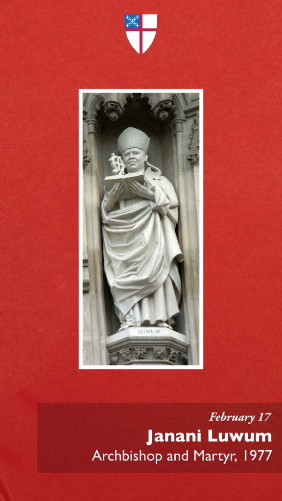 O God, whose Son the Good Shepherd laid down his life for his sheep: We give you thanks for your faithful shepherd, Janani Luwum, who after his Savior’s example gave up his life for the sake of his flock. Grant us to be so inspired by his witness that we make no peace with oppression, but live as those who are sealed with the cross of Christ, who died and rose again, and now lives and reigns with you and the Holy Spirit, one God, for ever and ever. Amen.
