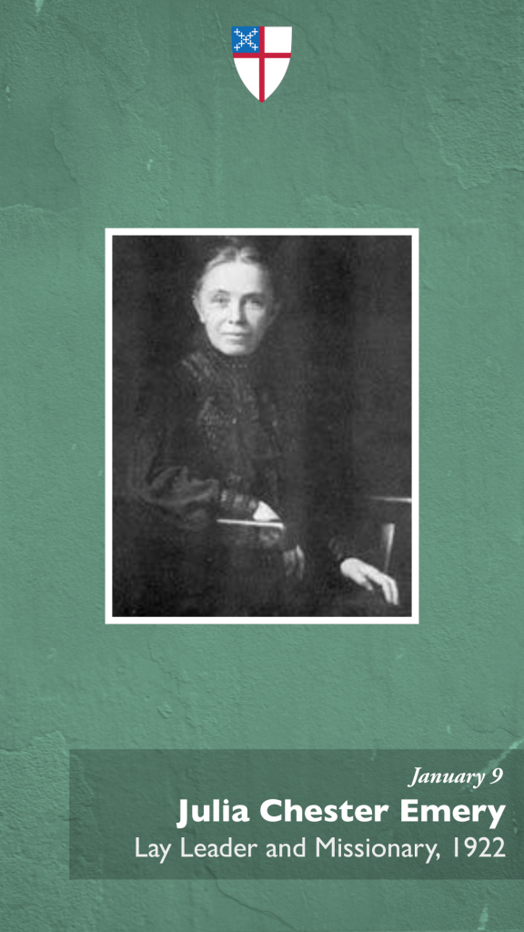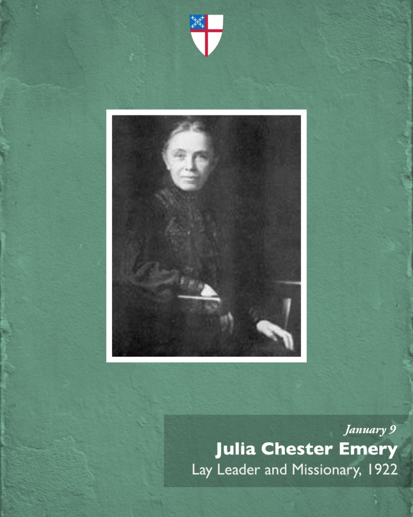 Sample Text: Today we remember Julia Chester Emery, lay leader and tireless advocate for mission, whose forty years of leadership helped shape The Episcopal Church’s commitment to global and domestic outreach. Her legacy includes the founding of the United Thank Offering and the empowerment of women in the life of the Church.