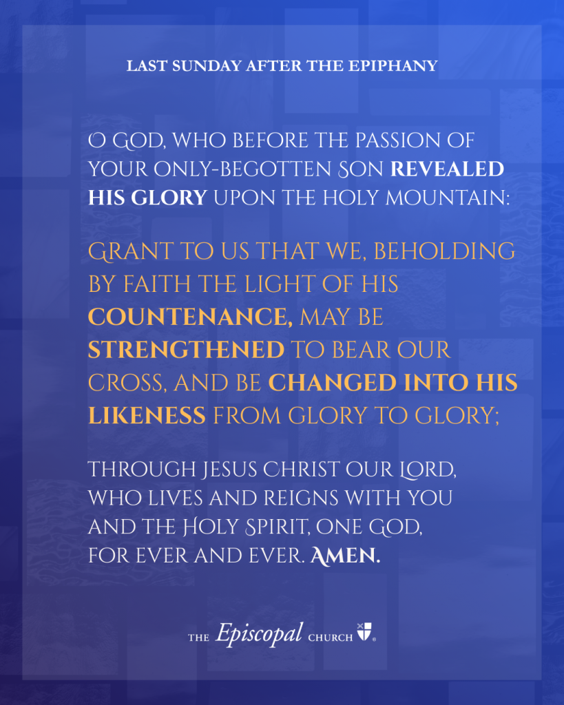 On this final Sunday after the Epiphany, we remember the God who revealed the glory of his only begotten Son on the holy mountain. We pray that, beholding by faith the light of Christ’s countenance, we may be strengthened to bear our cross and be transformed into his likeness, from glory to glory. As the disciples glimpsed the radiance of Jesus and heard the Father’s voice, we too listen to him, trusting that he will guide and sustain us on the way. #Episcopal