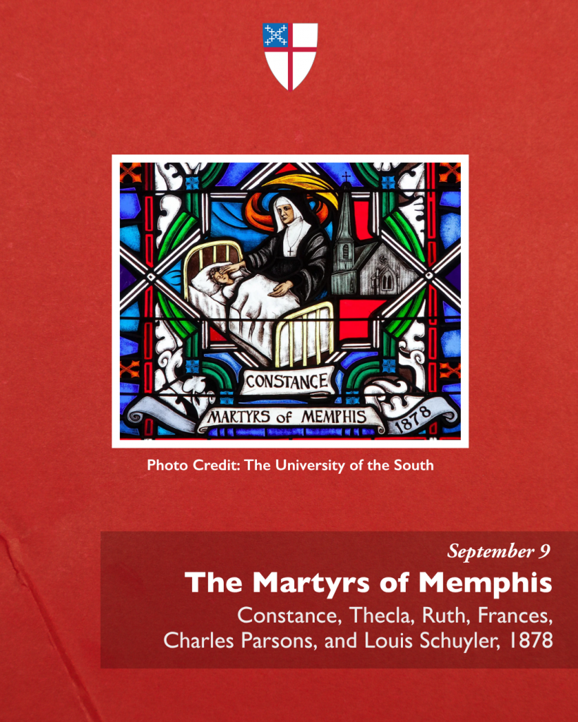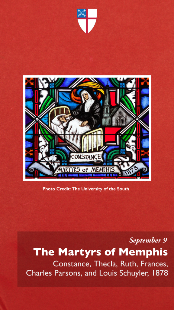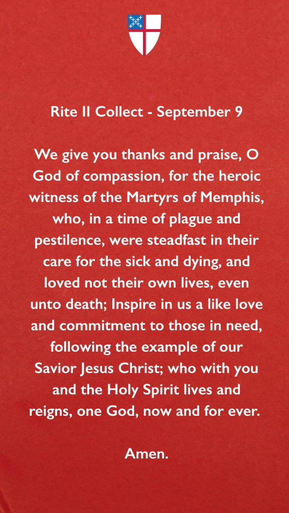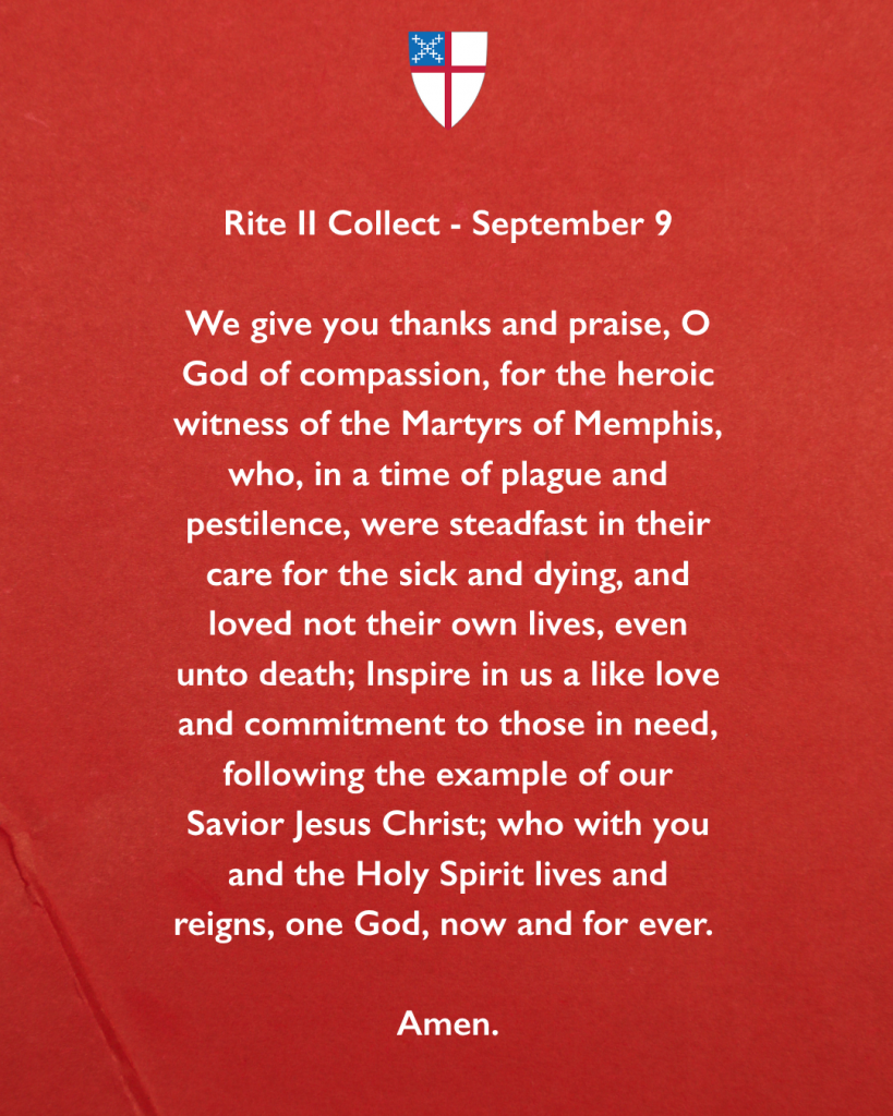 We give you thanks and praise, O God of compassion, for the heroic witness of the Martyrs of Memphis, who, in a time of plague and pestilence, were steadfast in their care for the sick and dying, and loved not their own lives, even unto death; Inspire in us a like love and commitment to those in need, following the example of our Savior Jesus Christ; who with you and the Holy Spirit lives and reigns, one God, now and for ever. Amen.