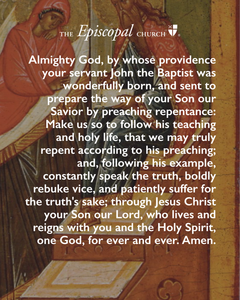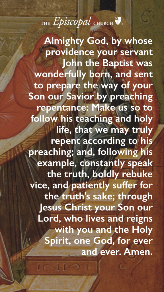 Almighty God, by whose providence your servant John the Baptist was wonderfully born, and sent to prepare the way of your Son our Savior by preaching repentance: Make us so to follow his teaching and holy life, that we may truly repent according to his preaching; and, following his example, constantly speak the truth, boldly rebuke vice, and patiently suffer for the truth’s sake; through Jesus Christ your Son our Lord, who lives and reigns with you and the Holy Spirit, one God, for ever and ever. Amen.
