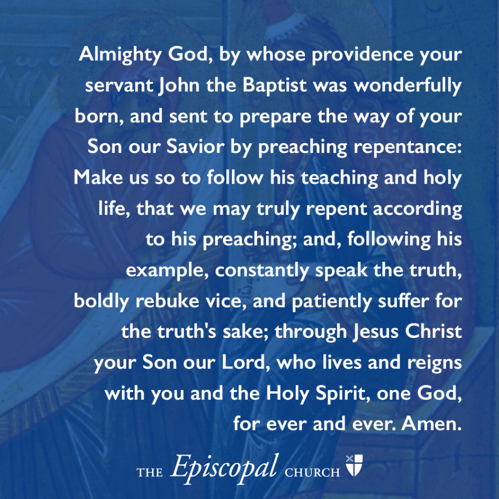 Almighty God, by whose providence your servant John the Baptist was wonderfully born, and sent to prepare the way of your Son our Savior by preaching repentance: Make us so to follow his teaching and holy life, that we may truly repent according to his preaching; and, following his example, constantly speak the truth, boldly rebuke vice, and patiently suffer for the truth’s sake; through Jesus Christ your Son our Lord, who lives and reigns with you and the Holy Spirit, one God, for ever and ever. Amen.