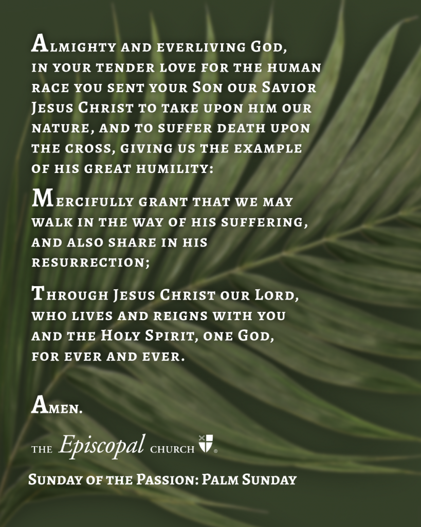 Almighty and everliving God, in your tender love for the human race you sent your Son our Savior Jesus Christ to take upon him our nature, and to suffer death upon the cross, giving us the example of his great humility: Mercifully grant that we may walk in the way of his suffering, and also share in his resurrection; through Jesus Christ our Lord, who lives and reigns with you and the Holy Spirit, one God, for ever and ever. Amen.