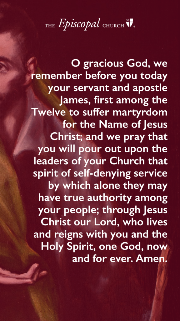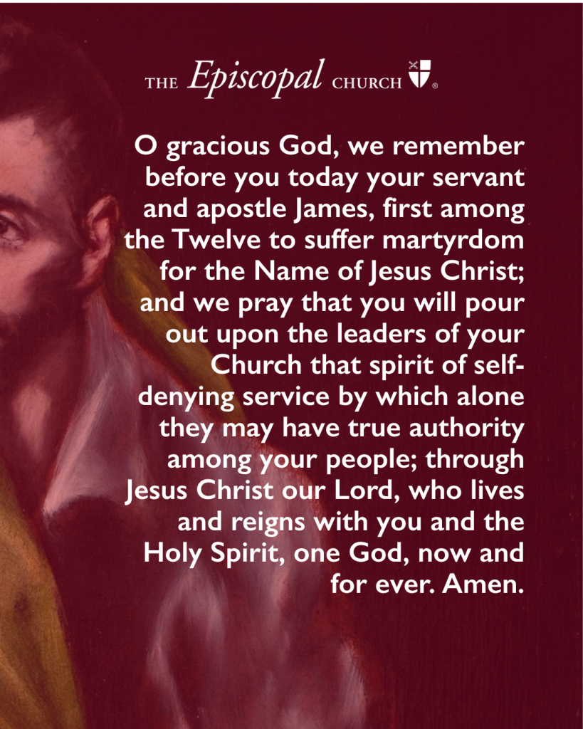 O gracious God, we remember before you today your servant and apostle James, first among the Twelve to suffer martyrdom for the Name of Jesus Christ; and we pray that you will pour out upon the leaders of your Church that spirit of self-denying service by which alone they may have true authority among your people; through Jesus Christ our Lord, who lives and reigns with you and the Holy Spirit, one God, now and for ever. Amen.