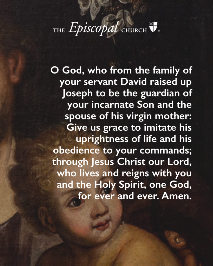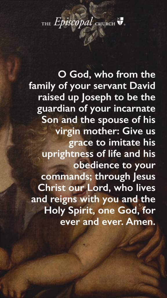O God, who from the family of your servant David raised up Joseph to be the guardian of your incarnate Son and the spouse of his virgin mother: Give us grace to imitate his uprightness of life and his obedience to your commands; through Jesus Christ our Lord, who lives and reigns with you and the Holy Spirit, one God, for ever and ever. Amen.