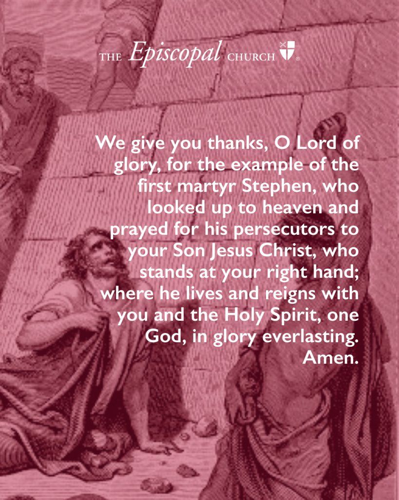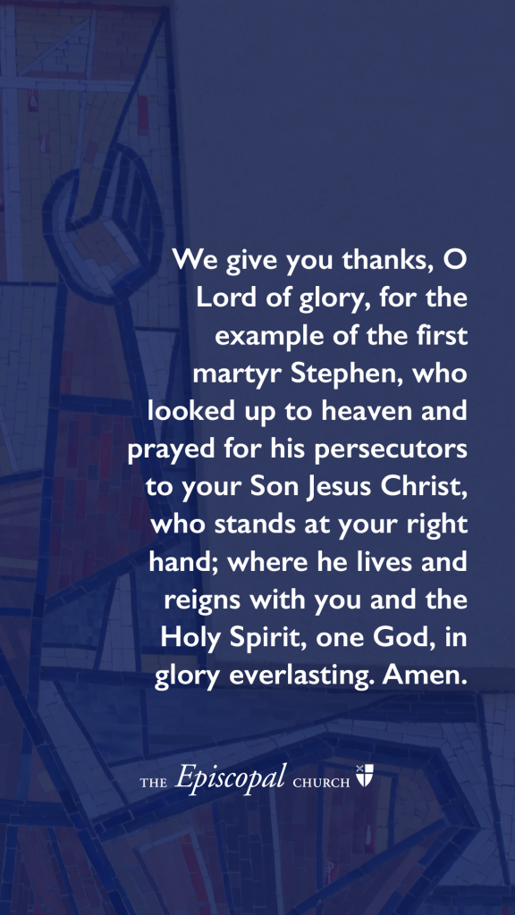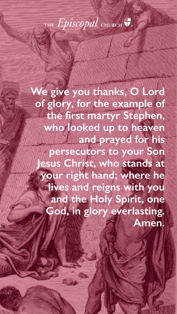 We give you thanks, O Lord of glory, for the example of the first martyr Stephen, who looked up to heaven and prayed for his persecutors to your Son Jesus Christ, who stands at your right hand; where he lives and reigns with you and the Holy Spirit, one God, in glory everlasting. Amen.