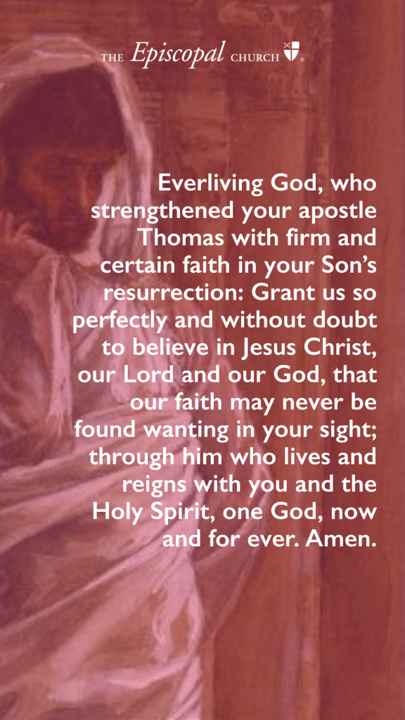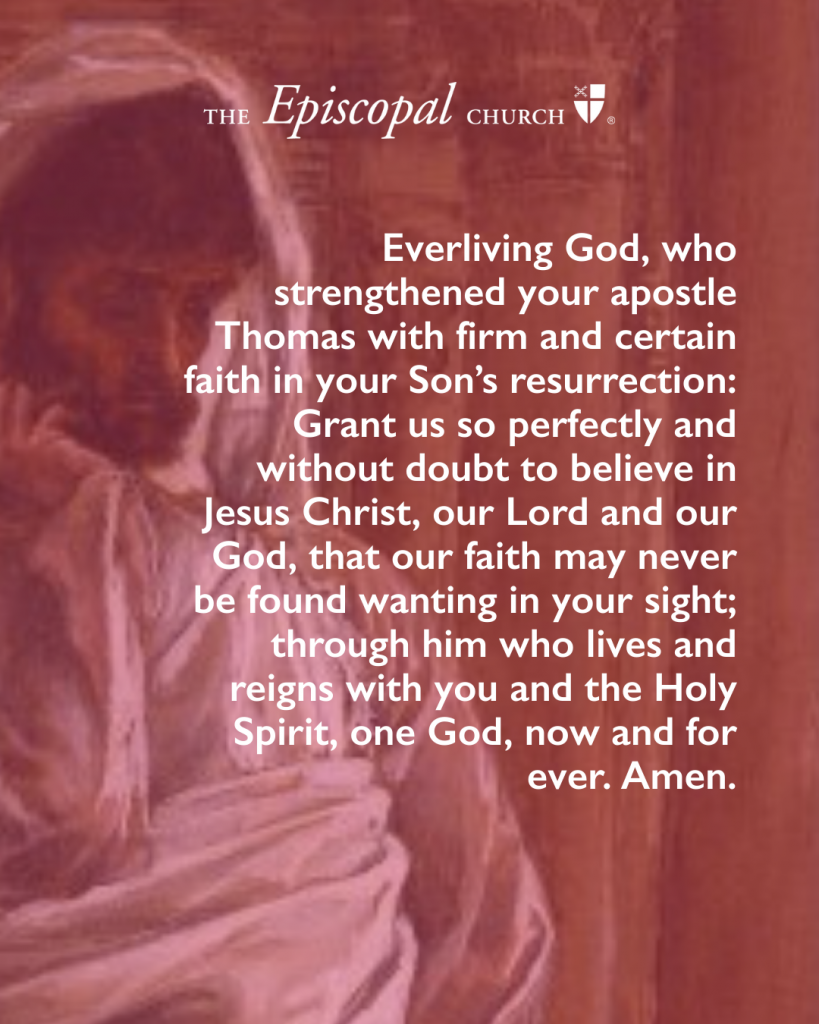 Everliving God, who didst strengthen thine apostle Thomas with sure and certain faith in thy Son’s resurrection: Grant us so perfectly and without doubt to believe in Jesus Christ, our Lord and our God, that our faith may never be found wanting in thy sight; through him who liveth and reigneth with thee and the Holy Spirit, one God, now and for ever. Amen.