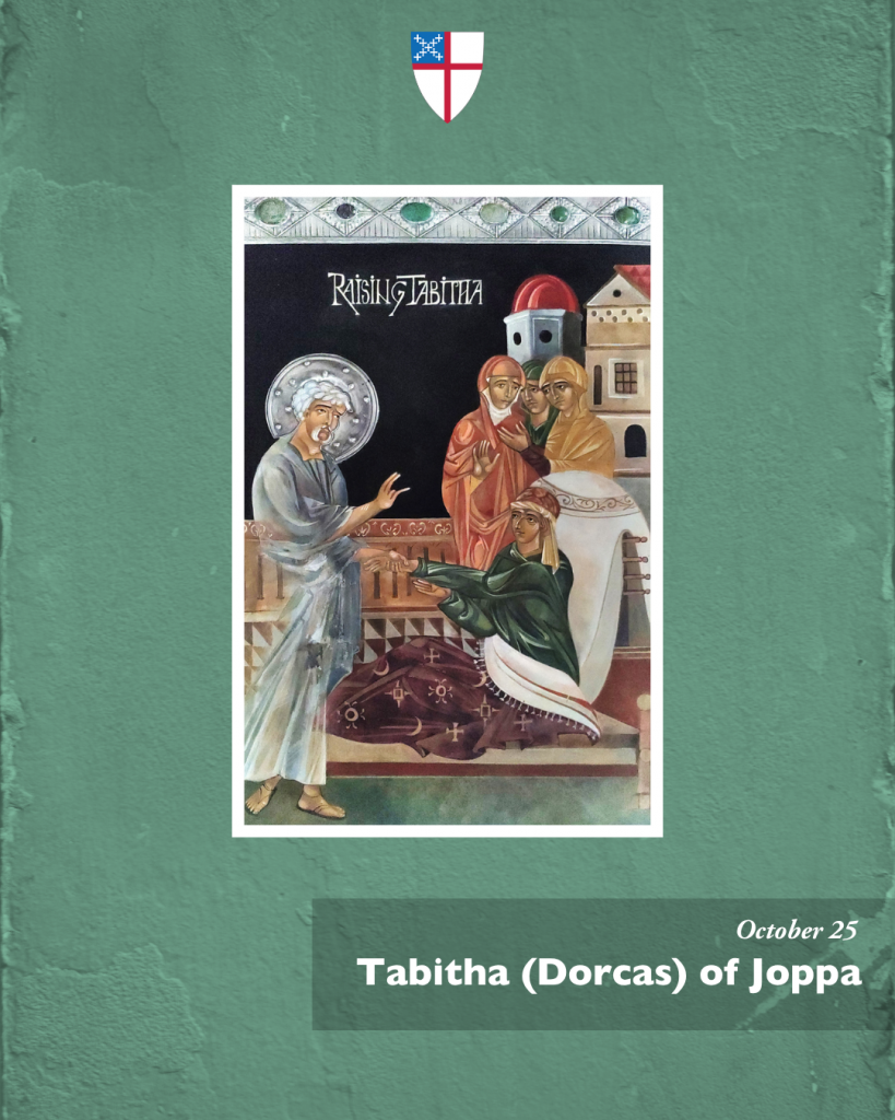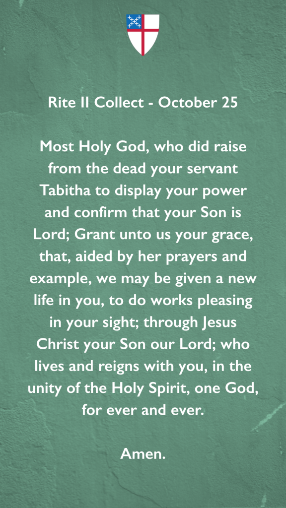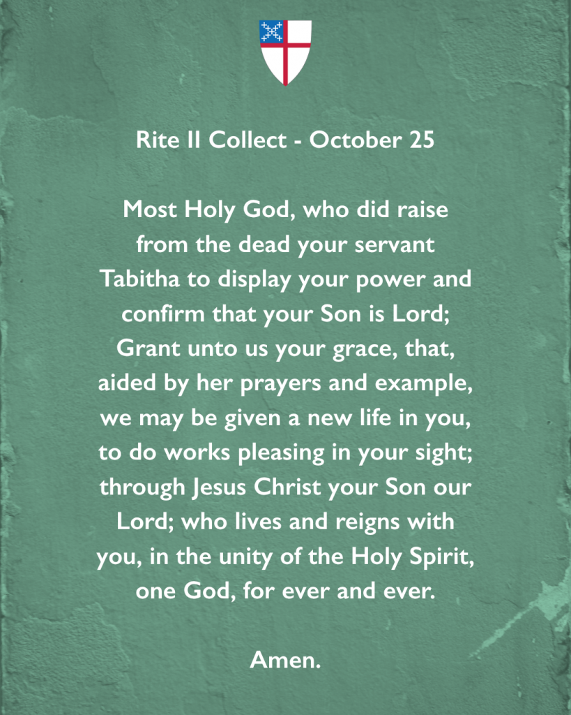 Most Holy God, who didst raise from the dead thy servant Tabitha to display thy power and confirm that thy Son is Lord; Grant unto us thy grace, that, aided by her prayers and example, we may be given a new life in thee, to do works pleasing in thy sight; through Jesus Christ thy Son our Lord; who liveth and reigneth with thee, in the unity of the Holy Ghost, one God, for ever and ever. Amen.