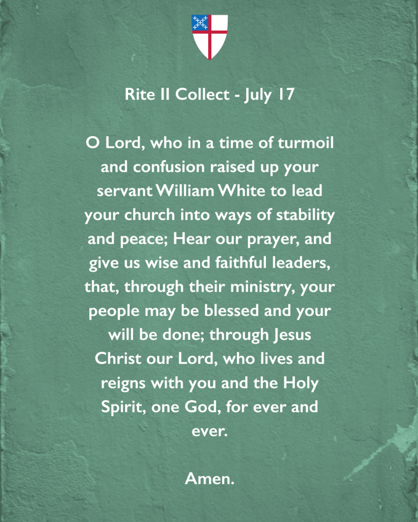 O Lord, who in a time of turmoil and confusion didst raise up thy servant William White to lead thy church into ways of stability and peace; Hear our prayer, and give us wise and faithful leaders, that, through their ministry, thy people may be blessed and thy will be done; through Jesus Christ our Lord, who liveth and reigneth with thee and the Holy Ghost, one God, for ever and ever. Amen.