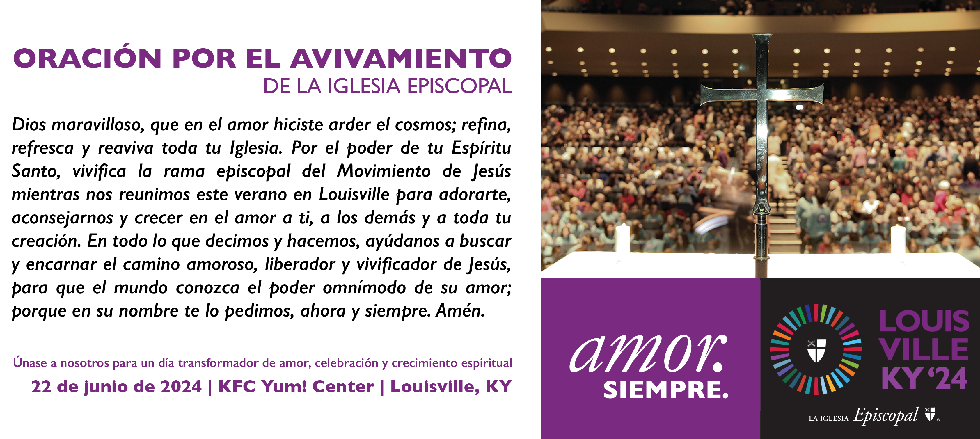 Dios maravilloso, que en el amor hiciste arder el cosmos; refina, refresca y reaviva toda tu Iglesia. Por el poder de tu Espíritu Santo, vivifica la rama episcopal del Movimiento de Jesús mientras nos reunimos este verano en Louisville para adorarte, aconsejarnos y crecer en el amor a ti, a los demás y a toda tu creación. En todo lo que decimos y hacemos, ayúdanos a buscar y encarnar el camino amoroso, liberador y vivificador de Jesús, para que el mundo conozca el poder omnímodo de su amor; porque en su nombre te lo pedimos, ahora y siempre. Amén.