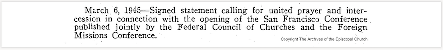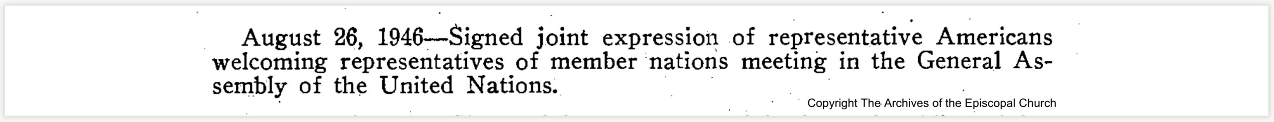 The information below is based in part on research by The Archives of The Episcopal Church and highlights selected UN-related activities of The Episcopal Church and individual Episcopalians, paired with archival documents illustrating the events.