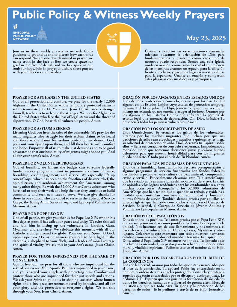 Como iglesia, nuestra defensoría continúa, y los invitamos a unirse a nosotros. La Red Episcopal de Políticas Públicas cuenta con alertas semanales de acción, recursos, seminarios web y capacitaciones. Entérese más aquí.